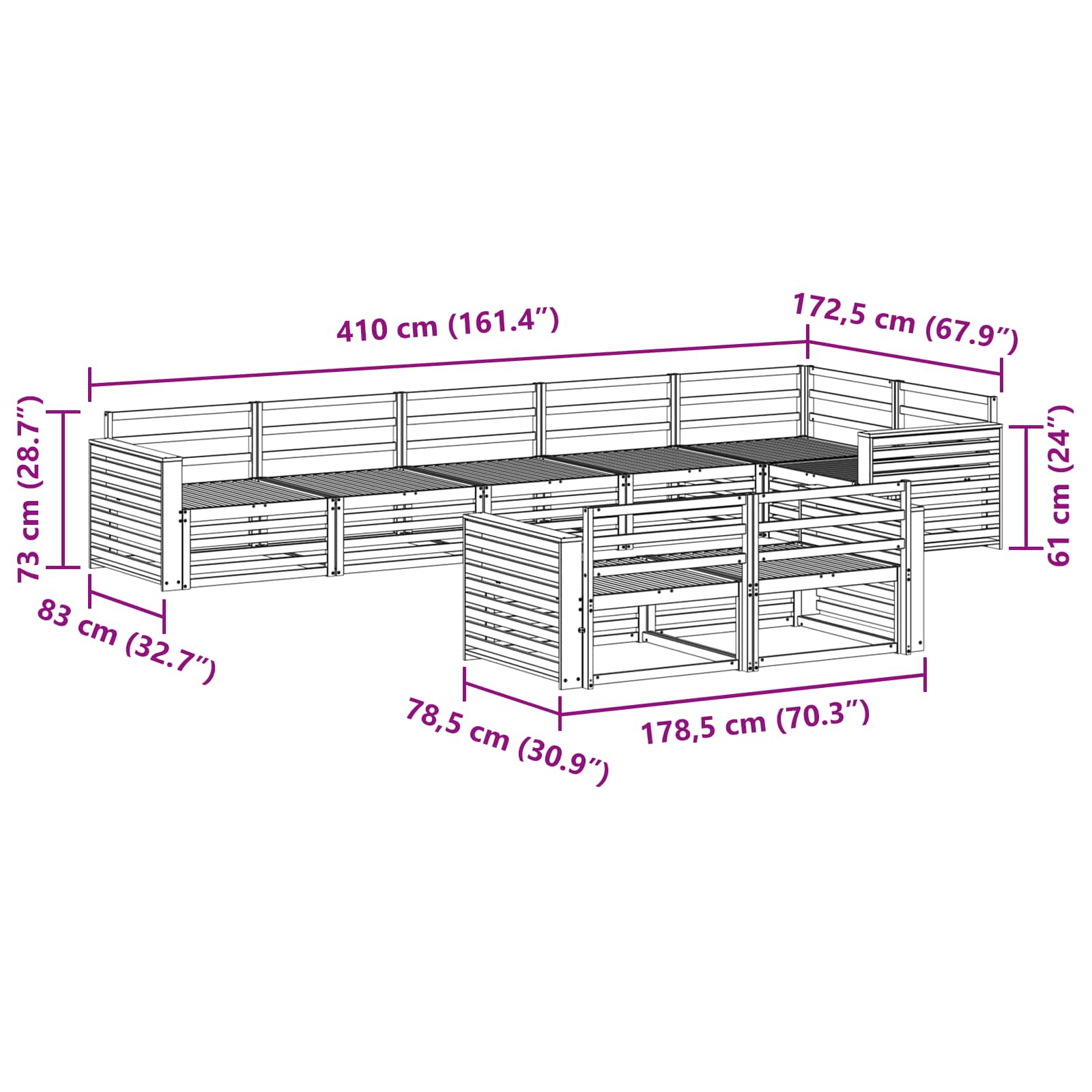 - Gesamtabmessungen: 410 x 172,5 x 73 cm (L x B x H)