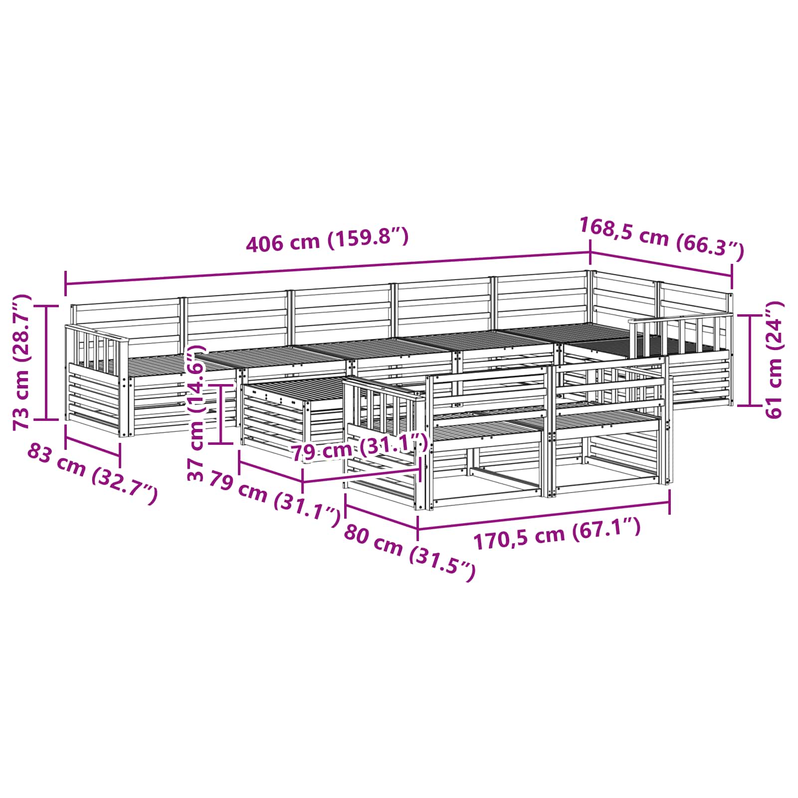 - 4 x Armlehne: 80 x 6 x 61 cm (LxBxH)