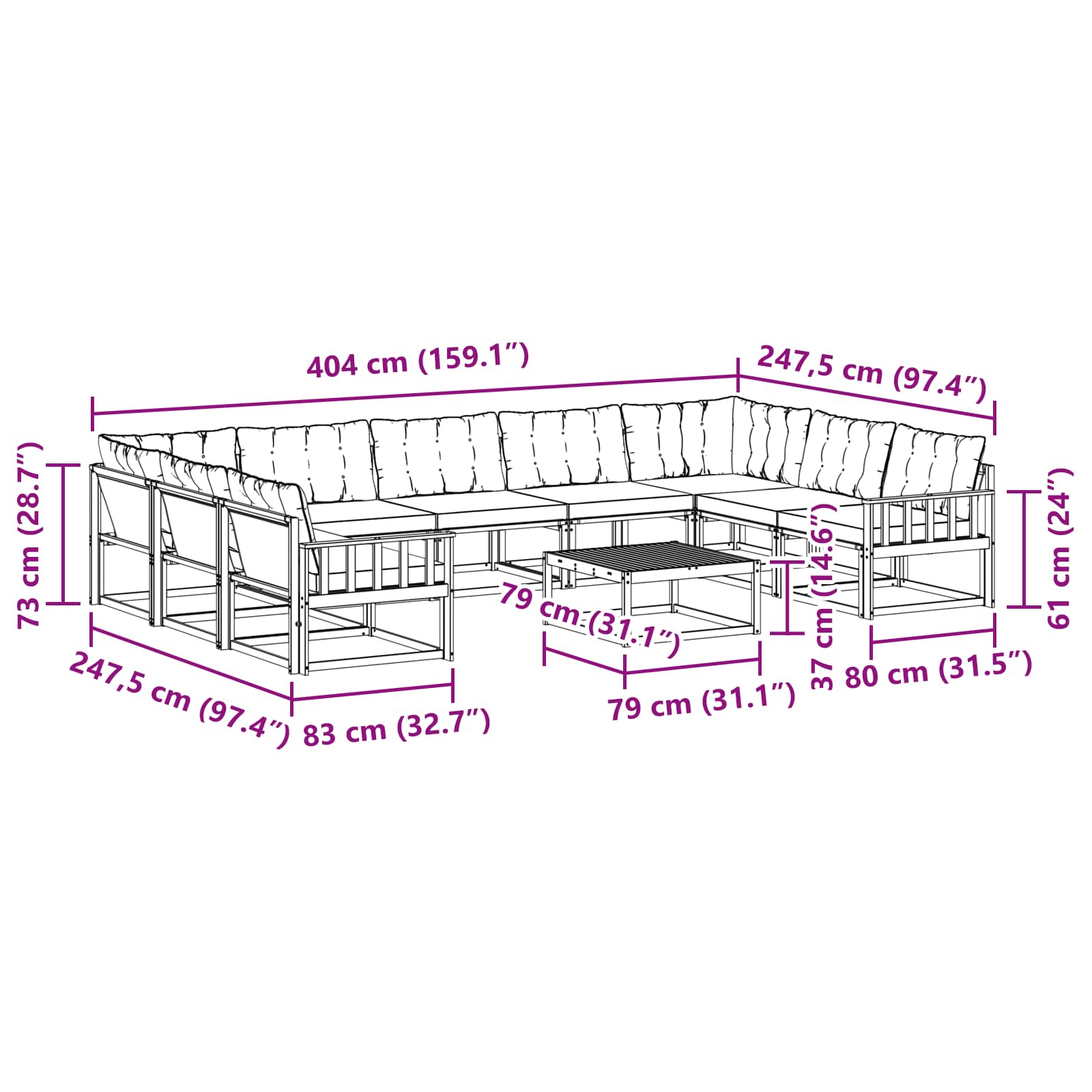 - 7 x Mittelsitz: 79 x 83 x 73 cm (LxBxH)