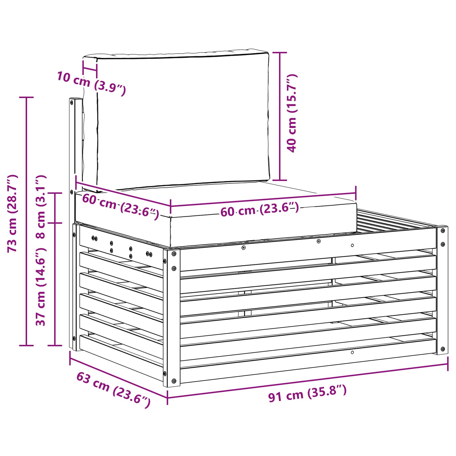 - 2 x Sitzkissen: 60 x 60 x 8 cm (LxBxH)