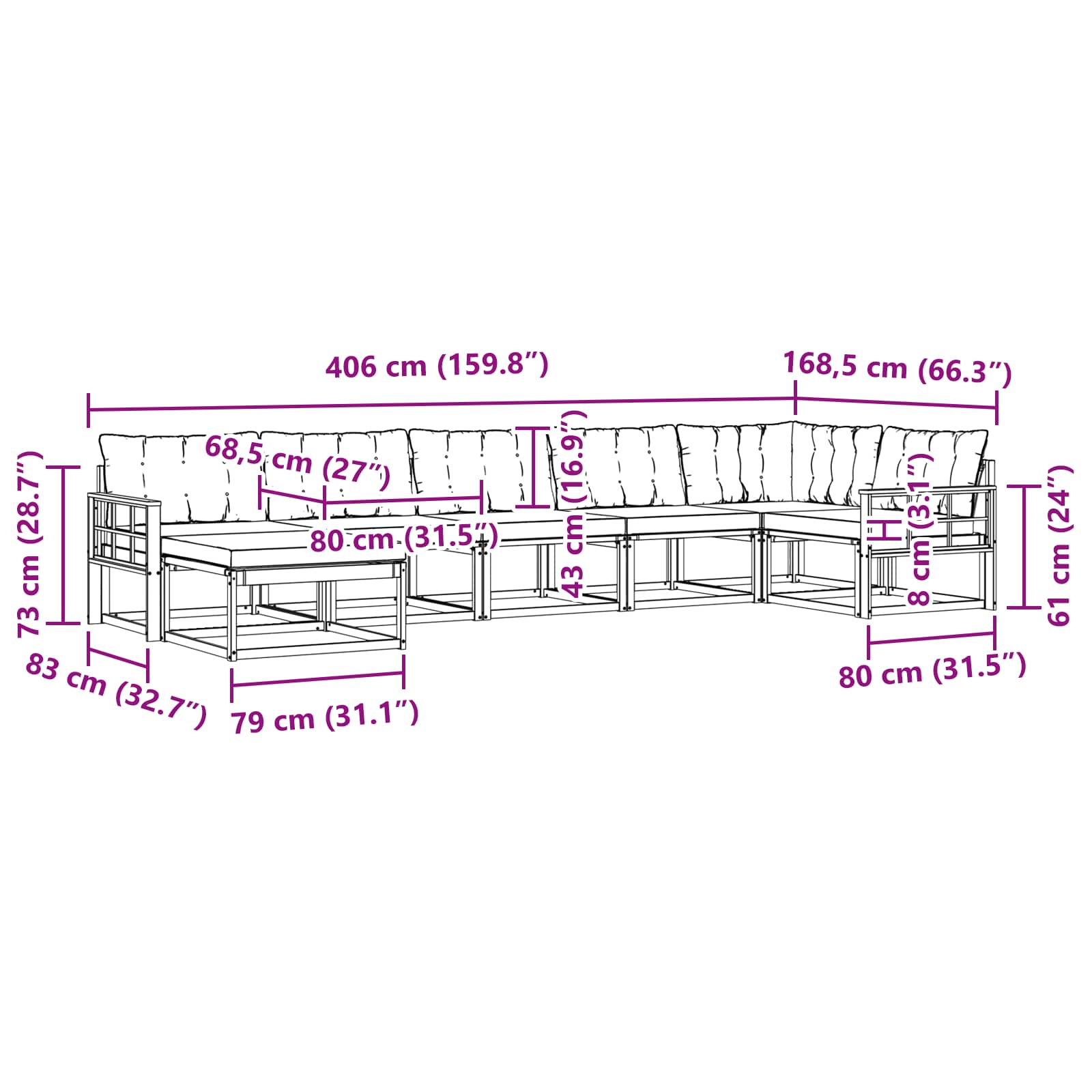 - Gesamtabmessungen: 406 x 168,5 x 73 cm (L x B x H)