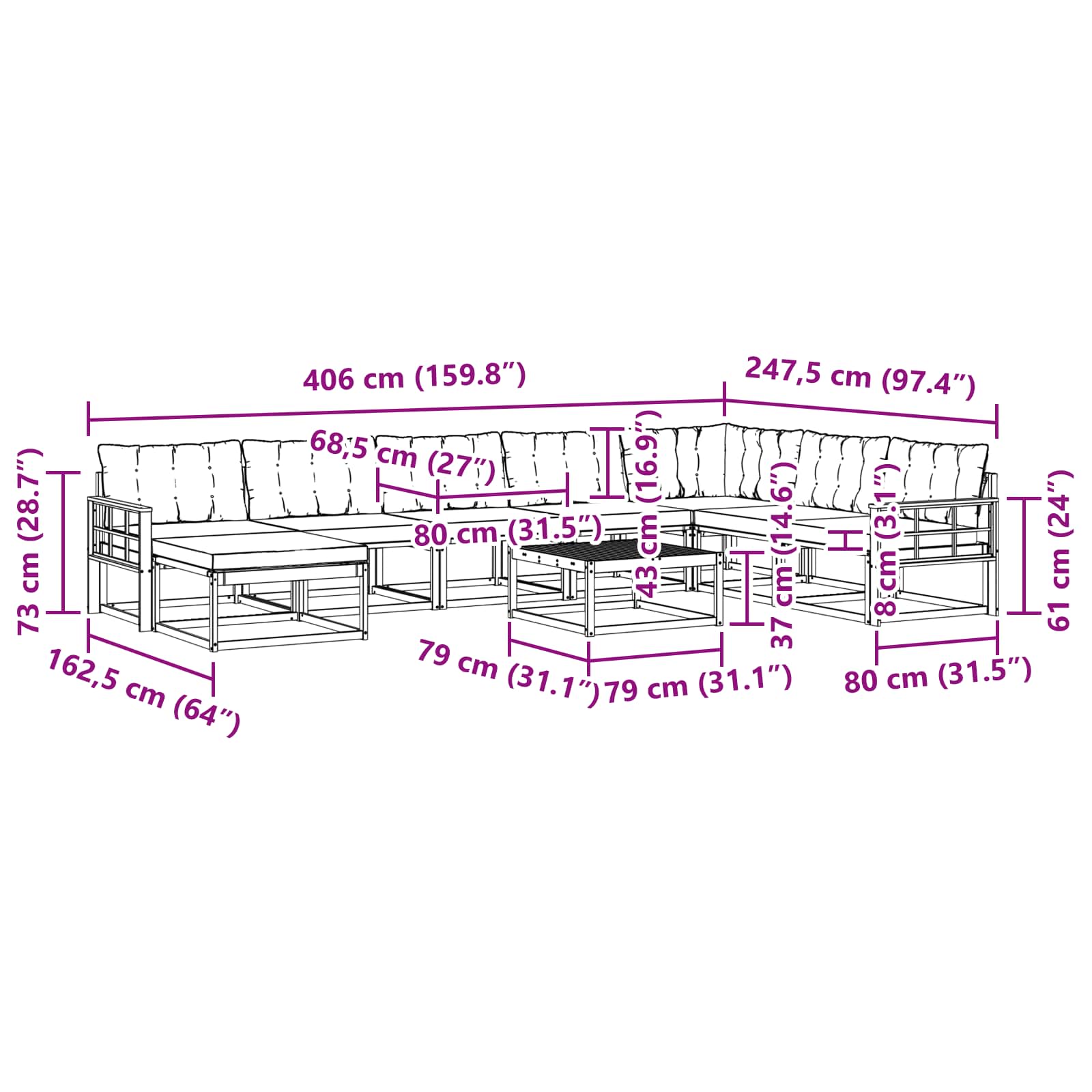- 6 x Sitzkissen: 80 x 68,5 x 8 cm (LxBxH)