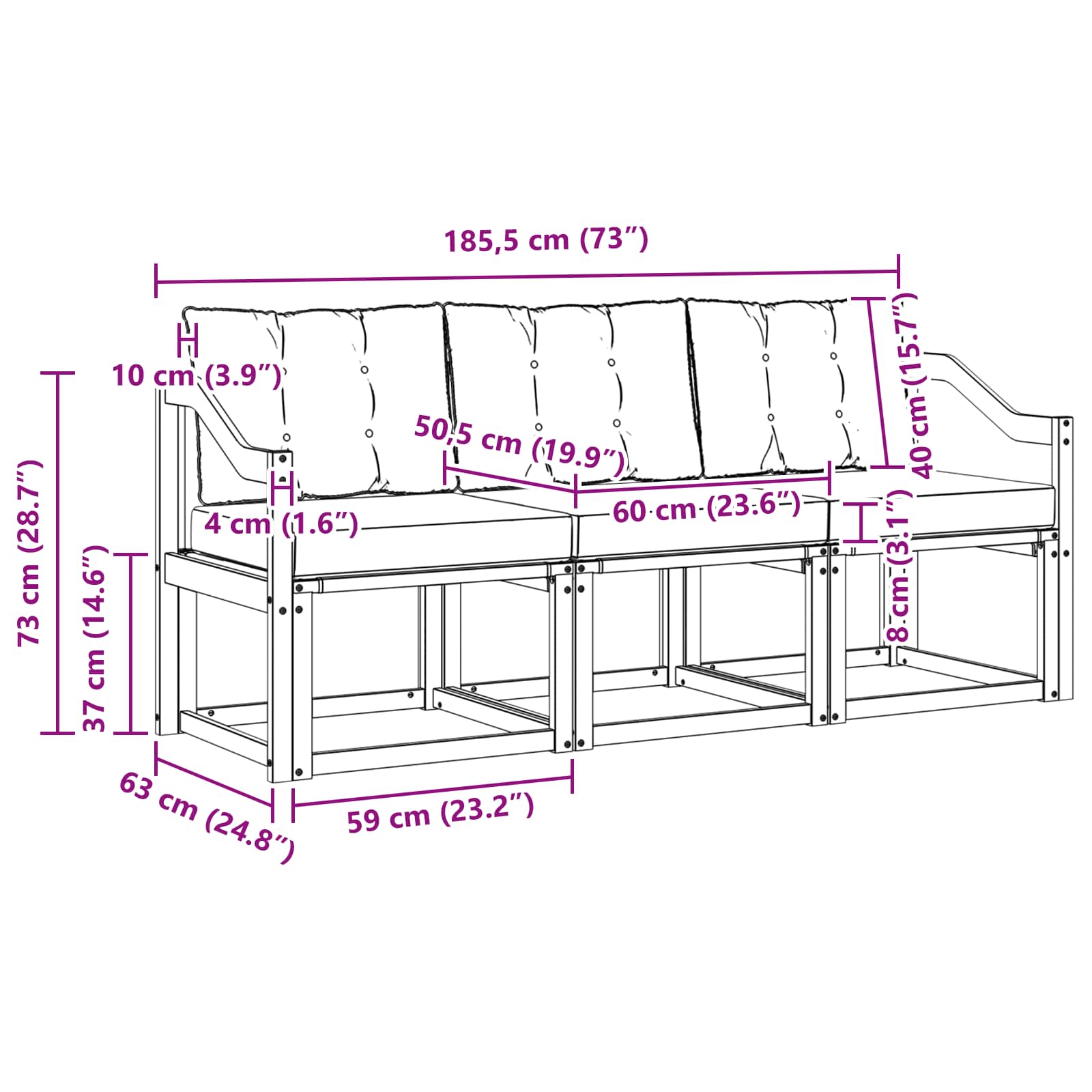 - Gesamtabmessungen: 185,5 x 63 x 73 cm (L x B x H)
