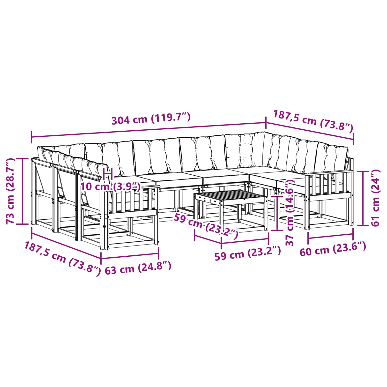 - Gesamtabmessungen: 304 x 187,5 x 73 cm (L x B x H)