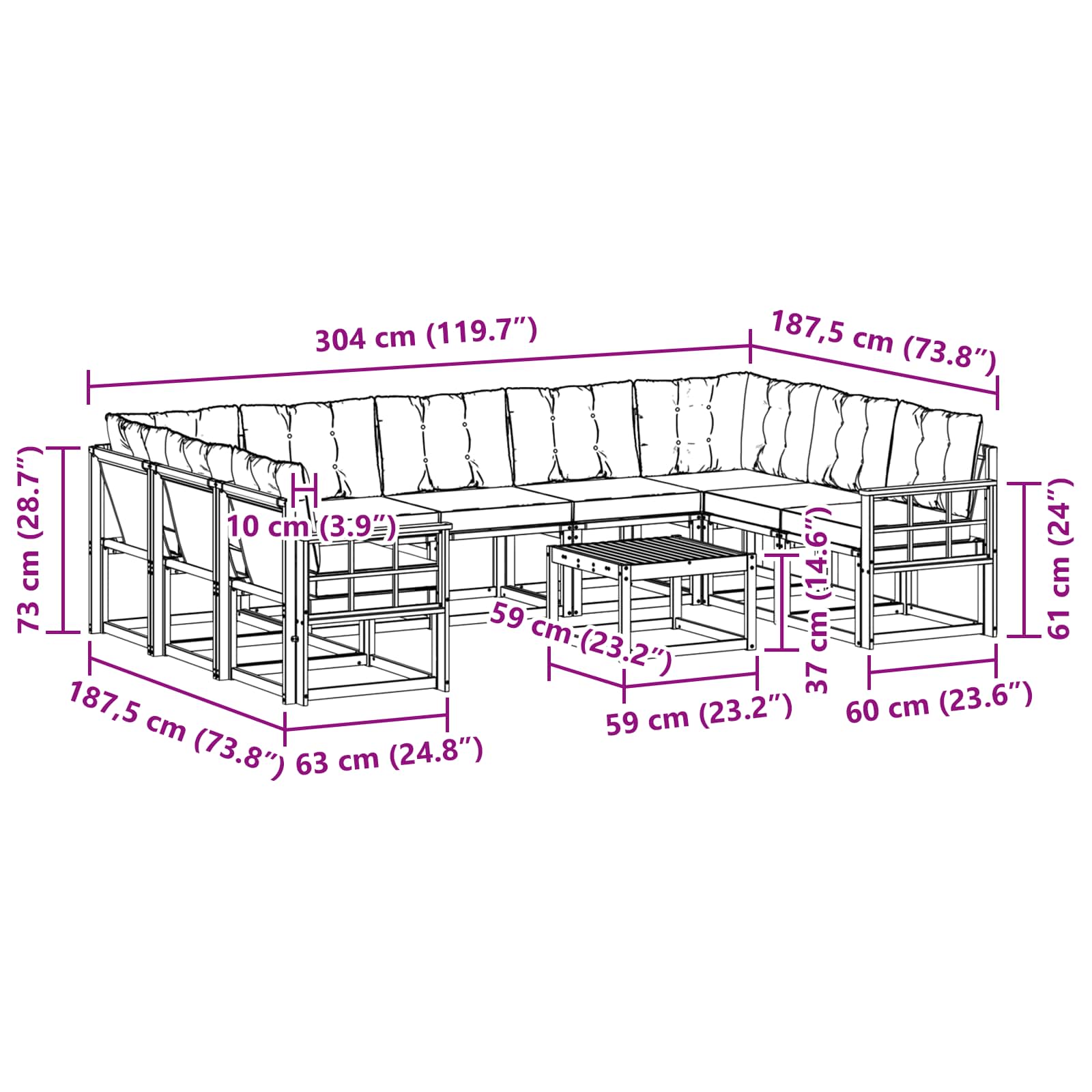 - Gesamtabmessungen: 304 x 187,5 x 73 cm (L x B x H)