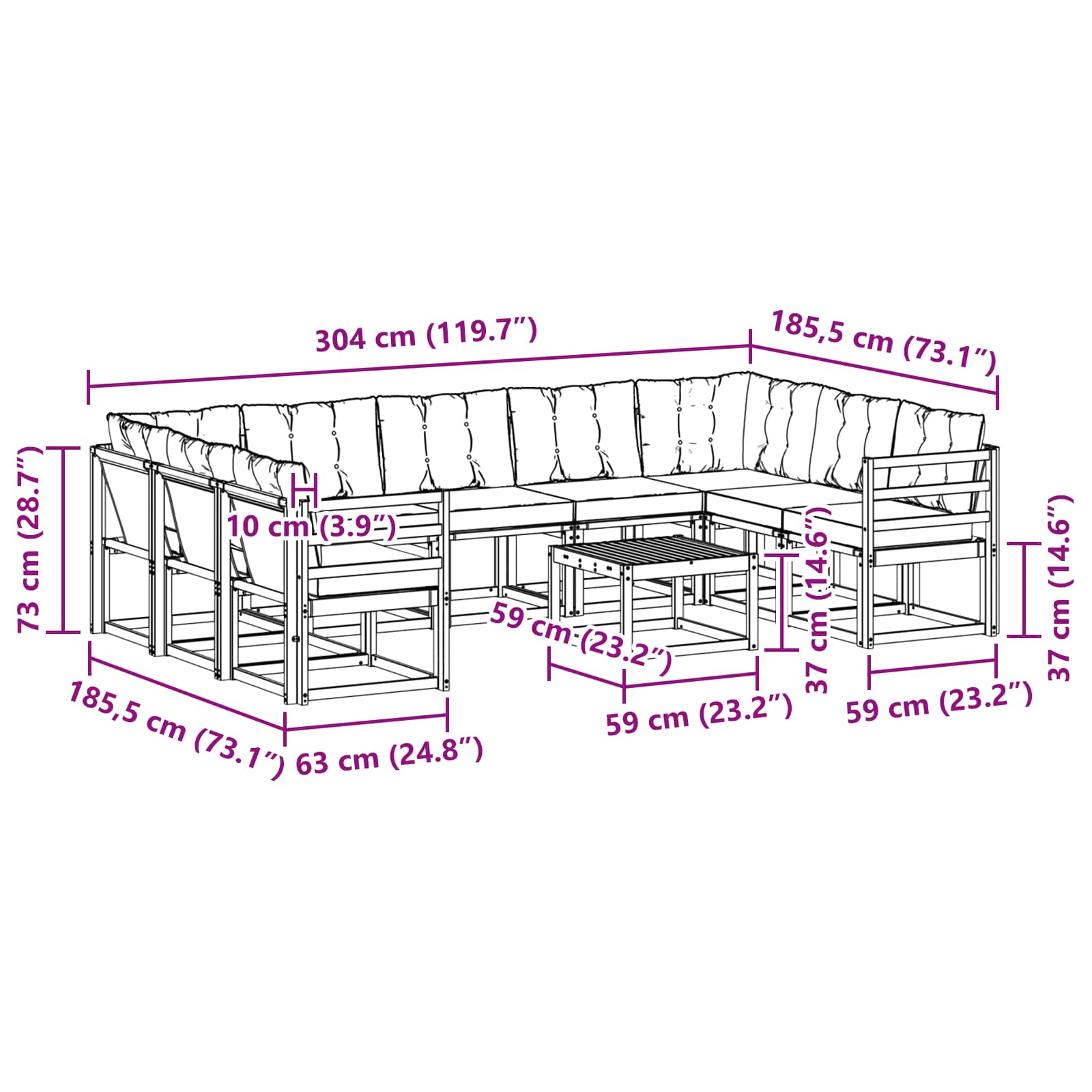 - Gesamtabmessungen: 304 x 185,5 x 73 cm (L x B x H)