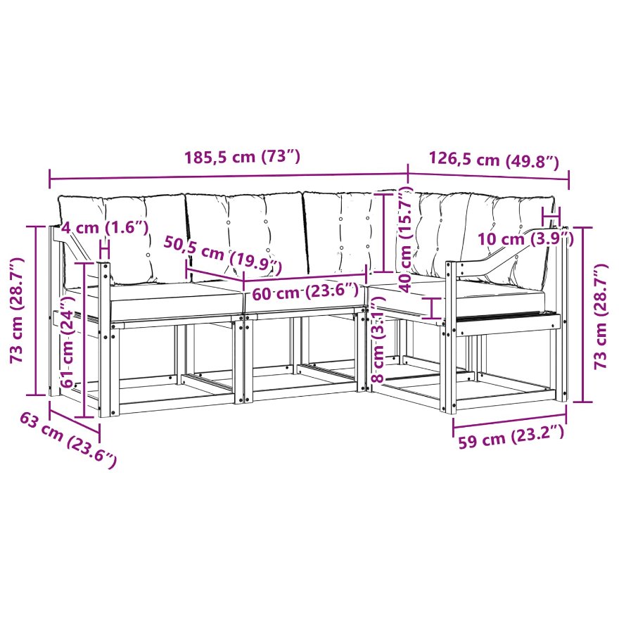 - Gesamtabmessungen: 185,5 x 126,5 x 73 cm (L x B x H)