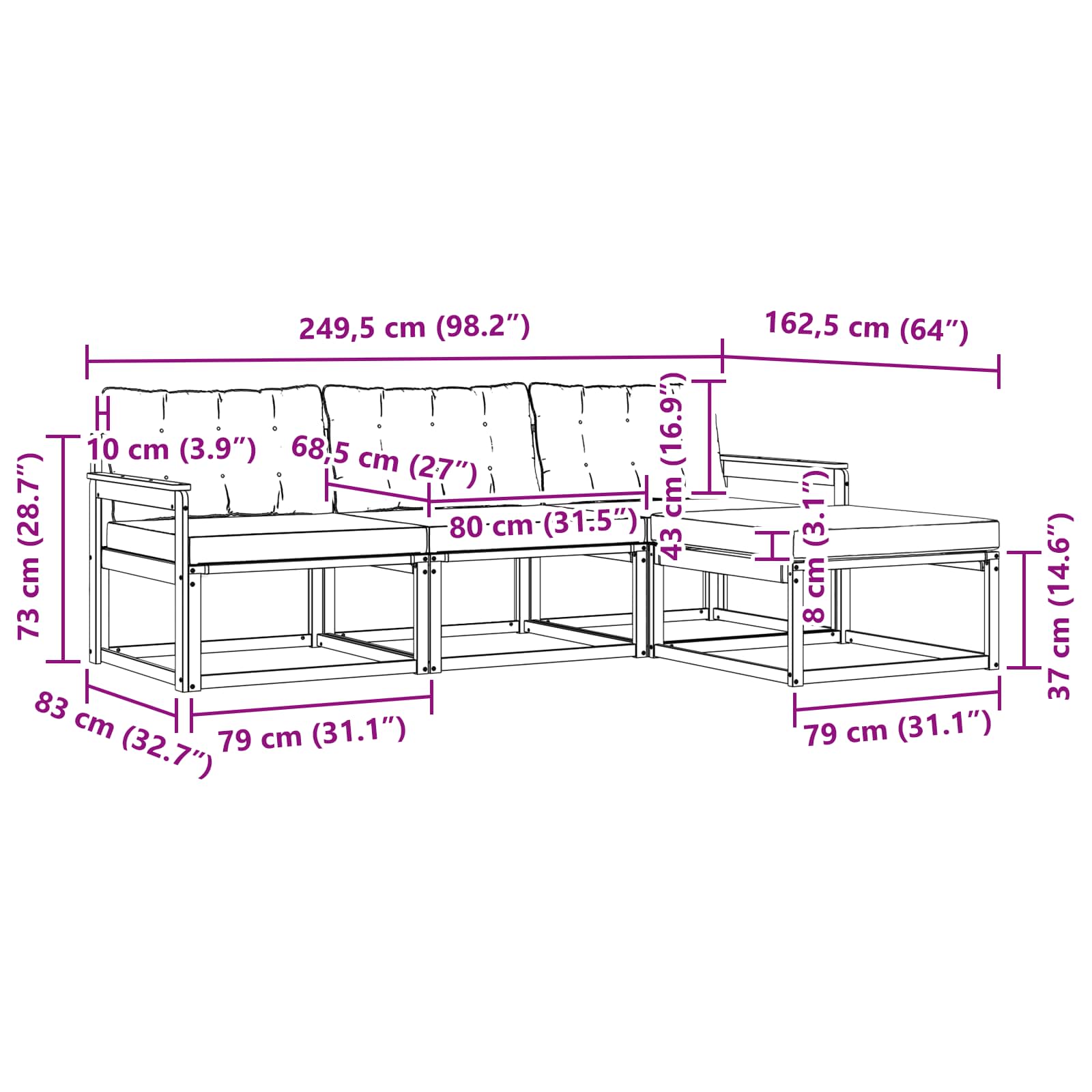 - Gesamtabmessungen: 249,5 x 162,5 x 73 cm (L x B x H)