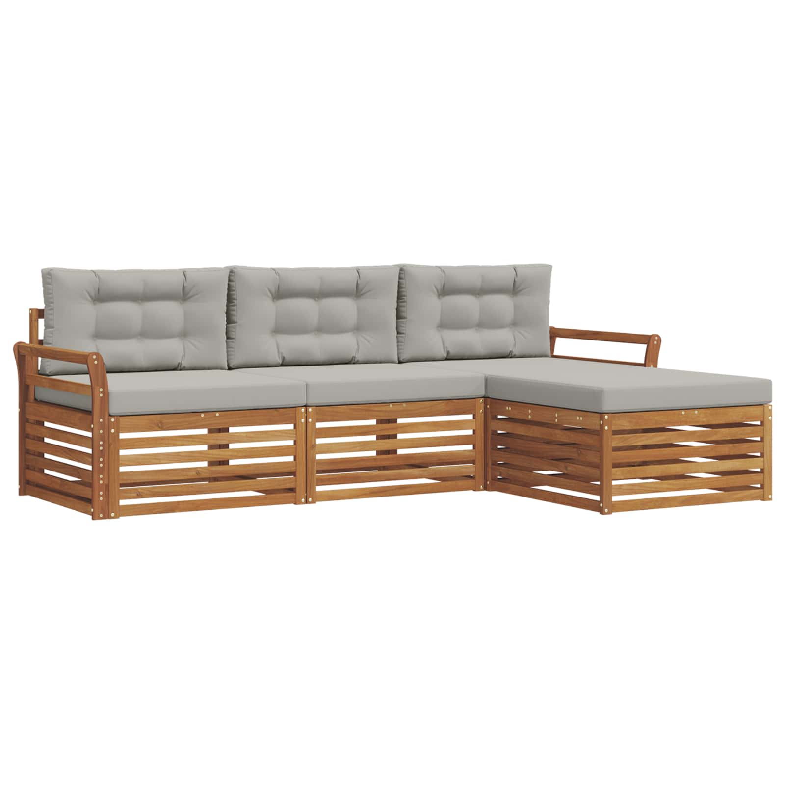 Das Outdoor-Möbelset bringt Stil und Funktionalität zusammen und ist das Herzstück für jeden Garten oder jede Terrasse. Mit seinem modernen Design und den klaren Linien wirkt es elegant und ermöglicht gemütliche Stunden im Freien. Hergestellt aus solidem Akazienholz, bietet das Set nicht nur Langlebigkeit, sondern bleibt auch optisch ansprechend. Ideal für alle, die praktische und schicke Möbel für den Außenbereich suchen. Langlebiges Massivholz Akazie: Dieses Set aus solidem Akazienholz ist extrem langlebig und wetterfest. Es bietet zuverlässige Unterstützung und bleibt über lange Zeit stabil, während der warme Farbton deinem Garten oder deiner Terrasse eine besondere Note verleiht. Wetterfeste Bauweise: Mit einer lackierten Oberfläche schützt dieses Outdoor-Möbelset gegen Sonne, leichten Regen und andere Einflüsse. Das polierte Finish hilft, das Aussehen und die Funktionalität lange zu bewahren. Komponenten & Design: Jedes Teil, von den Armlehnen bis zu den Rückenlehnen, ist stilvoll und praktisch. Komfortmerkmale machen das Sitzen noch angenehmer, und das durchdachte Design sorgt für ein harmonisches Gesamtbild. Komfort & Vielseitigkeit: Dank des modularen Designs kannst du das Set flexibel konfigurieren, um deinen Bedürfnissen gerecht zu werden. Egal, ob du relaxen, Gäste empfangen oder lesen möchtest – dieses Set passt sich deiner Umgebung perfekt an. Einfache Pflege & Wartung: Halte die Möbel in Top-Zustand, indem du einfach mit einem feuchten Tuch drüber wischst und aggressive Reiniger vermeidest. So bleibt nicht nur das Aussehen, sondern auch die Lebensdauer erhalten.