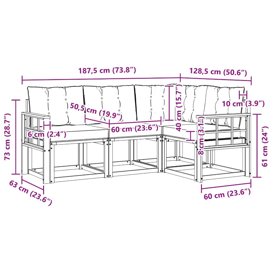 - 3 x Sitzkissen: 60 x 50,5 x 8 cm (LxBxH)