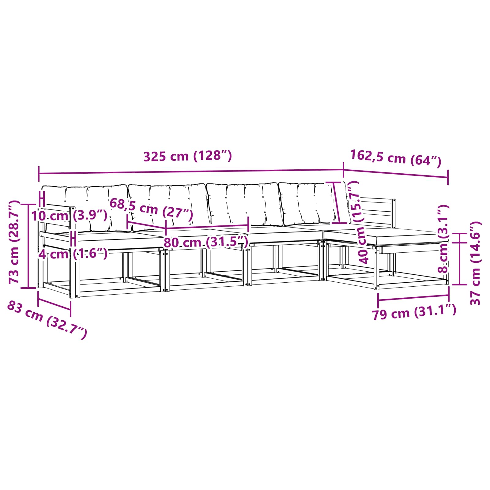 - Gesamtabmessungen: 325 x 162,5 x 73 cm (L x B x H)
