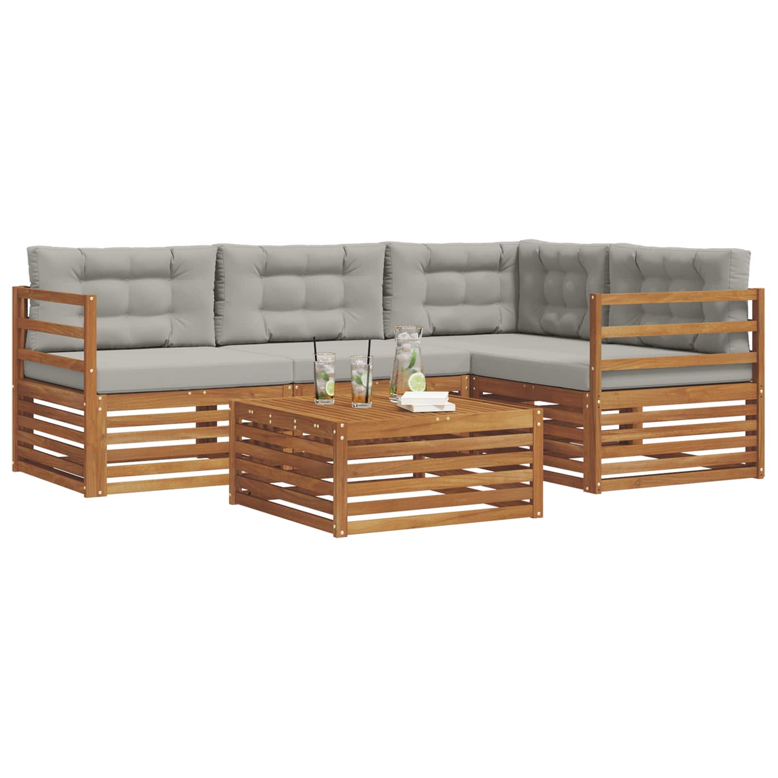 Das Outdoor-Möbelset bringt Style und Nutzen zusammen und ist der Blickfang für jeden Garten oder jede Terrasse. Das moderne Design mit klaren Linien und schlichten Details sorgt für Eleganz und unterstützt entspannte Momente im Freien sowie gesellige Treffen. Vollständig aus solidem Akazienholz gefertigt, bietet das Set nicht nur Langlebigkeit, sondern sieht auch lange gut aus, was es zur idealen Wahl für alle macht, die stylische und praktische Outdoor-Möbel suchen. Langlebiges Akazienholz: Hergestellt aus solidem Akazienholz, ist dieses Outdoor-Möbelset bekannt für seine Robustheit und Wetterfestigkeit. Die stabile Konstruktion sorgt für zuverlässige Unterstützung und bleibt lange stabil, während der warme Farbton jeden Garten oder jede Terrasse aufwertet. Wetterfestes Design: Das Outdoor-Möbelset hat eine lackierte Oberfläche, die zusätzlichen Schutz gegen Sonne, leichten Regen und andere Witterungseinflüsse bietet. Das polierte Finish hilft, sowohl Aussehen als auch Funktionalität zu erhalten und sorgt dafür, dass es lange hält, ob im Garten, auf der Terrasse oder im Hinterhof. Design und Komponenten: Jedes Stück, von den Armlehnen bis zu den Rückenlehnen, vereint Style und Funktion. Unterstützende Merkmale erhöhen den Komfort, während das harmonische Design für eine optisch ansprechende Anordnung sorgt, die für verschiedene Outdoor-Events geeignet ist. Komfort & Vielseitigkeit: Mit modularem Design erreichst du flexible Konfigurationen, die auf unterschiedliche Räume und Bedürfnisse abgestimmt sind. Ideal für Entspannung, gesellige Treffen oder ruhige Lesezeiten passt sich dieses Set ganz easy an jede Außenumgebung an und maximiert Komfort und Nutzerfreundlichkeit. Einfache Pflege: Um die Möbel in gutem Zustand zu halten, wisch einfach die Oberfläche mit einem feuchten Tuch ab und vermeide aggressive Reinigungsmittel. Regelmäßige Pflege nutzt den Möbeln und verlängert deren Lebensdauer.
