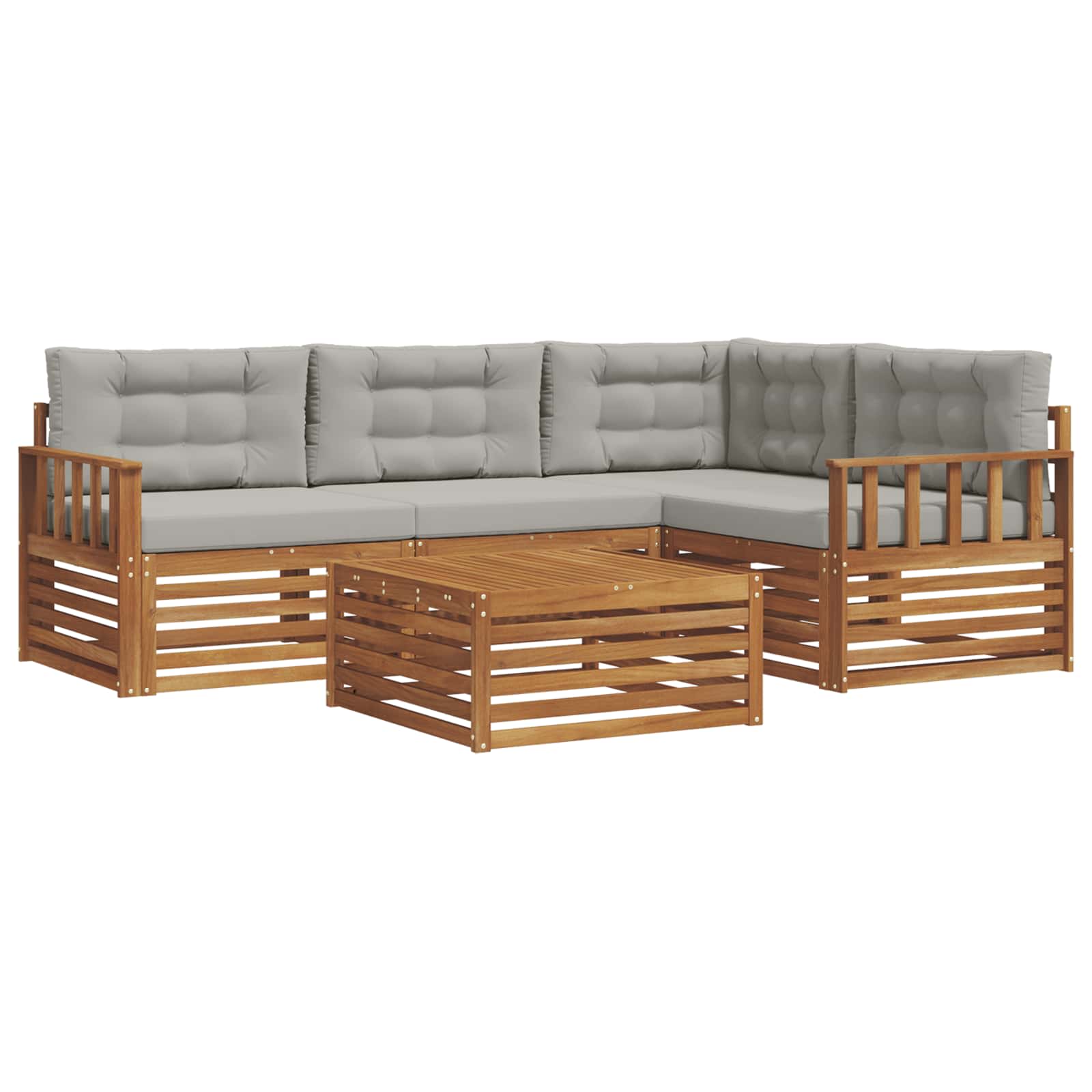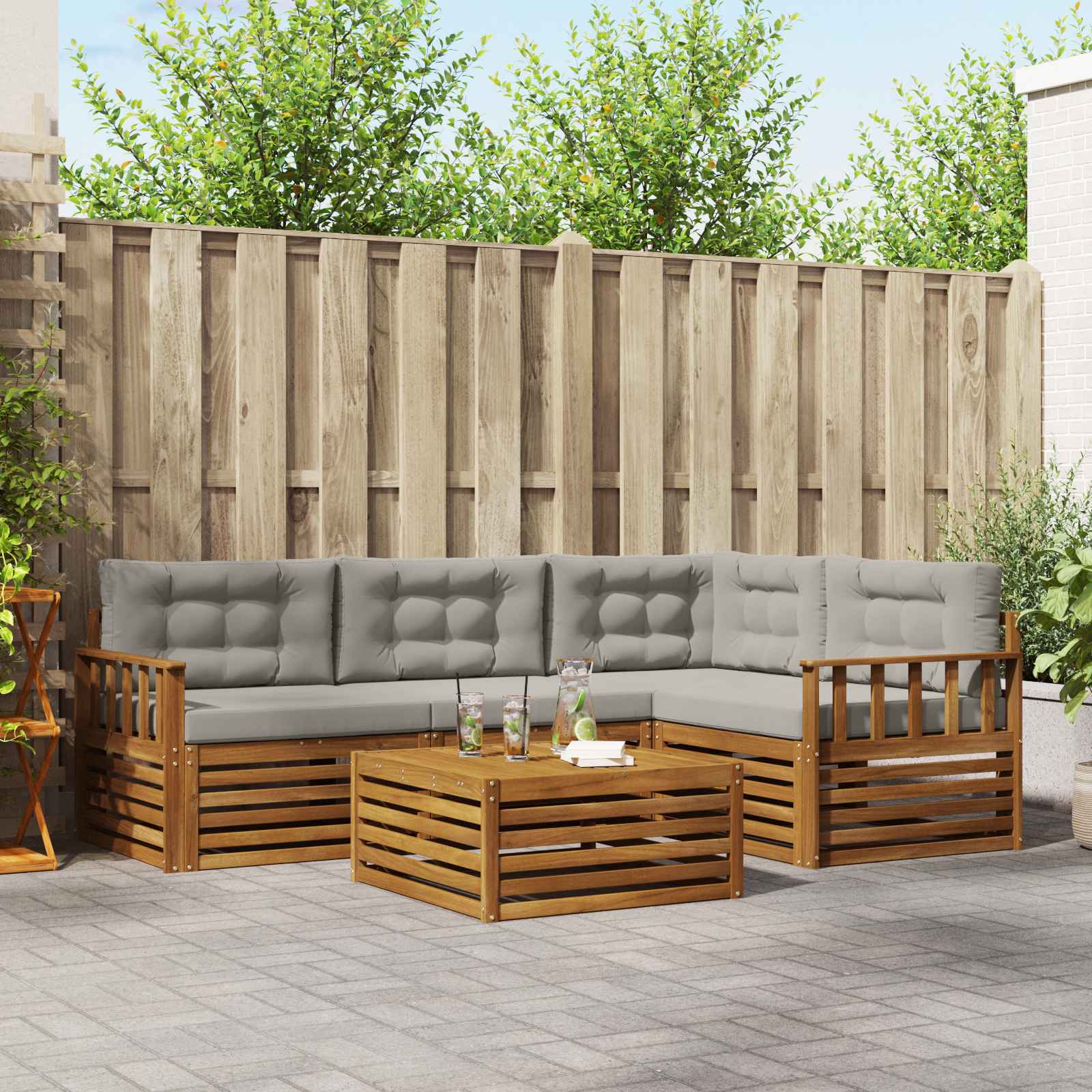 Das Outdoor-Möbelset bringt Style und Nutzen zusammen und ist der Blickfang für jeden Garten oder jede Terrasse. Das moderne Design mit klaren Linien und schlichten Details sorgt für Eleganz und unterstützt entspannte Momente im Freien sowie gesellige Treffen. Vollständig aus solidem Akazienholz gefertigt, bietet das Set nicht nur Langlebigkeit, sondern sieht auch lange gut aus, was es zur idealen Wahl für alle macht, die stylische und praktische Outdoor-Möbel suchen. Langlebiges Akazienholz: Hergestellt aus solidem Akazienholz, ist dieses Outdoor-Möbelset bekannt für seine Robustheit und Wetterfestigkeit. Die stabile Konstruktion sorgt für zuverlässige Unterstützung und bleibt lange stabil, während der warme Farbton jeden Garten oder jede Terrasse aufwertet. Wetterfestes Design: Das Outdoor-Möbelset hat eine lackierte Oberfläche, die zusätzlichen Schutz gegen Sonne, leichten Regen und andere Witterungseinflüsse bietet. Das polierte Finish hilft, sowohl Aussehen als auch Funktionalität zu erhalten und sorgt dafür, dass es lange hält, ob im Garten, auf der Terrasse oder im Hinterhof. Design und Komponenten: Jedes Stück, von den Armlehnen bis zu den Rückenlehnen, vereint Style und Funktion. Unterstützende Merkmale erhöhen den Komfort, während das harmonische Design für eine optisch ansprechende Anordnung sorgt, die für verschiedene Outdoor-Events geeignet ist. Komfort & Vielseitigkeit: Mit modularem Design erreichst du flexible Konfigurationen, die auf unterschiedliche Räume und Bedürfnisse abgestimmt sind. Ideal für Entspannung, gesellige Treffen oder ruhige Lesezeiten passt sich dieses Set ganz easy an jede Außenumgebung an und maximiert Komfort und Nutzerfreundlichkeit. Einfache Pflege: Um die Möbel in gutem Zustand zu halten, wisch einfach die Oberfläche mit einem feuchten Tuch ab und vermeide aggressive Reinigungsmittel. Regelmäßige Pflege nutzt den Möbeln und verlängert deren Lebensdauer.