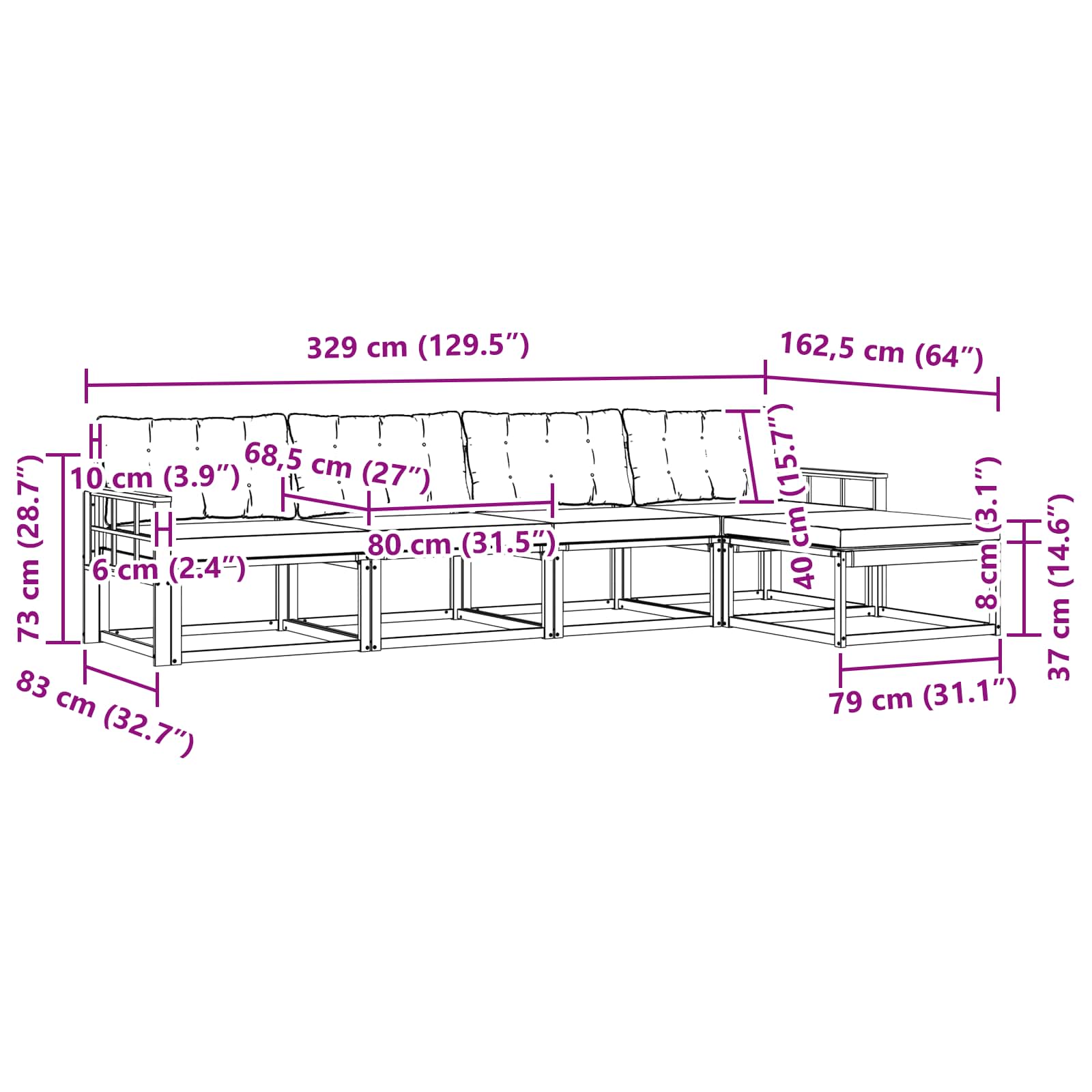 - Gesamtabmessungen: 329 x 162,5 x 73 cm (L x B x H)