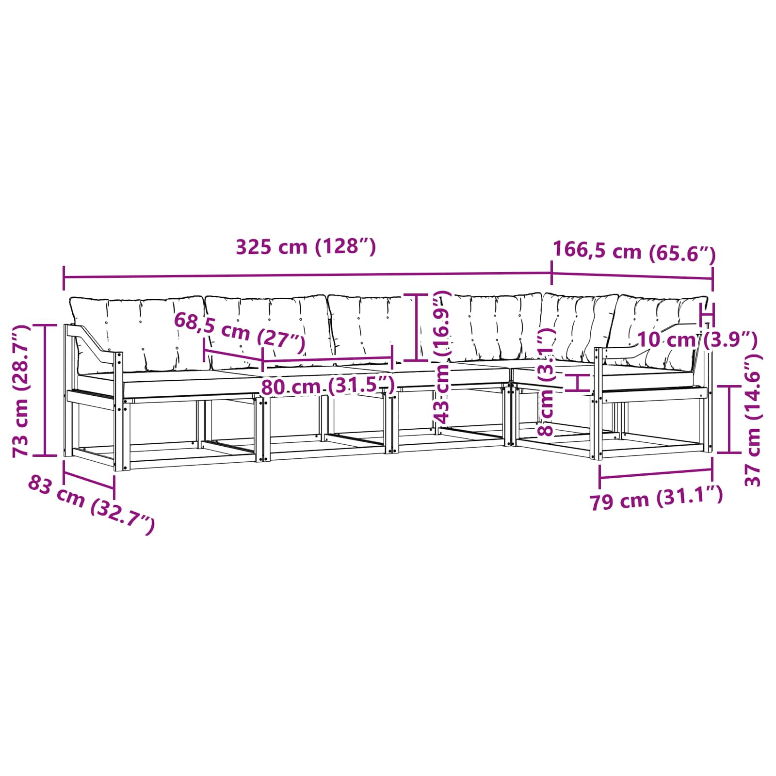 - Gesamtabmessungen: 325 x 166,5 x 73 cm (L x B x H)