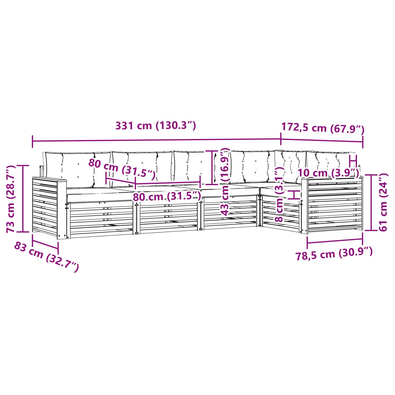 - Gesamtabmessungen: 331 x 172,5 x 73 cm (L x B x H)