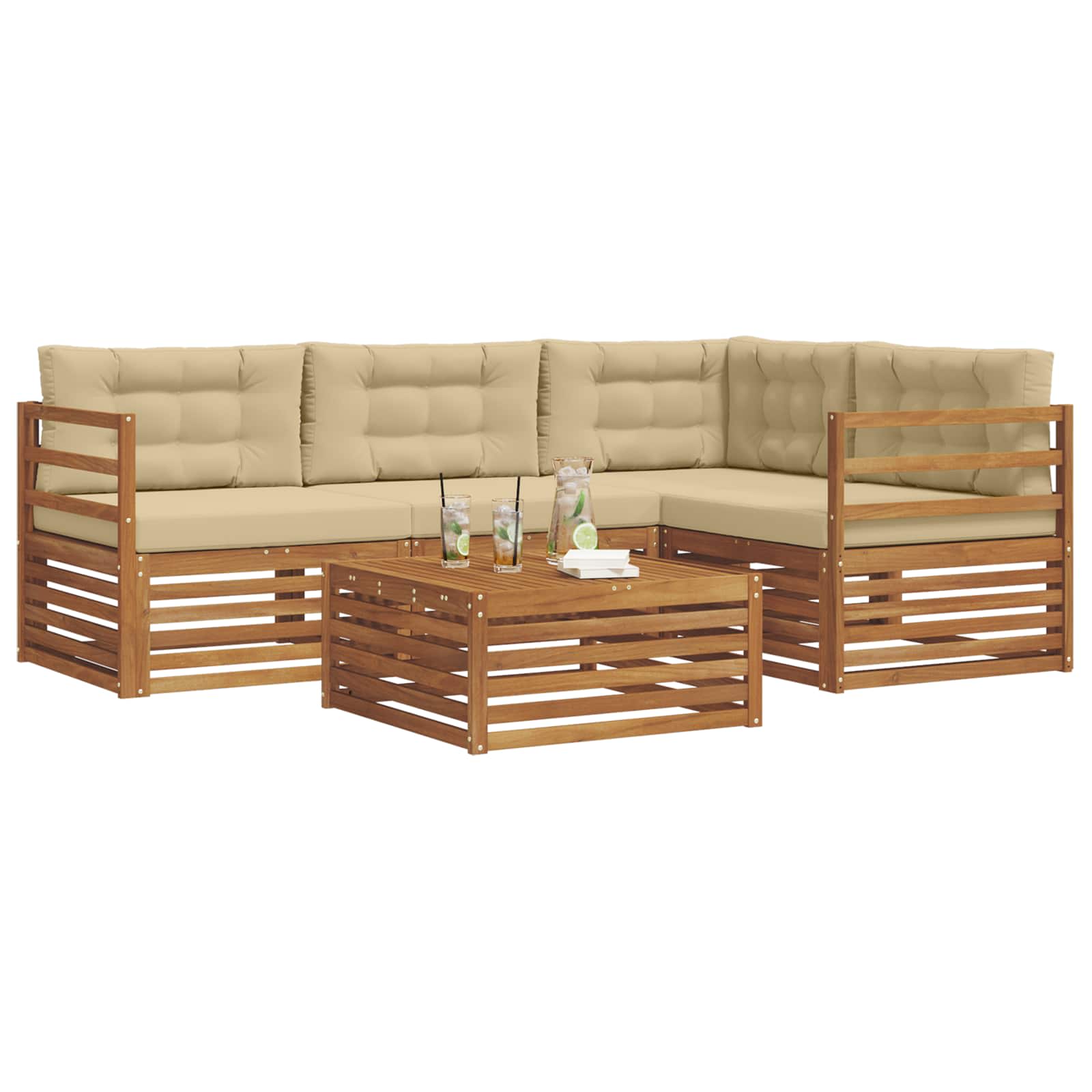 Das Outdoor-Möbelset bringt Style und Nutzen zusammen und ist der Blickfang für jeden Garten oder jede Terrasse. Das moderne Design mit klaren Linien und schlichten Details sorgt für Eleganz und unterstützt entspannte Momente im Freien sowie gesellige Treffen. Vollständig aus solidem Akazienholz gefertigt, bietet das Set nicht nur Langlebigkeit, sondern sieht auch lange gut aus, was es zur idealen Wahl für alle macht, die stylische und praktische Outdoor-Möbel suchen. Langlebiges Akazienholz: Hergestellt aus solidem Akazienholz, ist dieses Outdoor-Möbelset bekannt für seine Robustheit und Wetterfestigkeit. Die stabile Konstruktion sorgt für zuverlässige Unterstützung und bleibt lange stabil, während der warme Farbton jeden Garten oder jede Terrasse aufwertet. Wetterfestes Design: Das Outdoor-Möbelset hat eine lackierte Oberfläche, die zusätzlichen Schutz gegen Sonne, leichten Regen und andere Witterungseinflüsse bietet. Das polierte Finish hilft, sowohl Aussehen als auch Funktionalität zu erhalten und sorgt dafür, dass es lange hält, ob im Garten, auf der Terrasse oder im Hinterhof. Design und Komponenten: Jedes Stück, von den Armlehnen bis zu den Rückenlehnen, vereint Style und Funktion. Unterstützende Merkmale erhöhen den Komfort, während das harmonische Design für eine optisch ansprechende Anordnung sorgt, die für verschiedene Outdoor-Events geeignet ist. Komfort & Vielseitigkeit: Mit modularem Design erreichst du flexible Konfigurationen, die auf unterschiedliche Räume und Bedürfnisse abgestimmt sind. Ideal für Entspannung, gesellige Treffen oder ruhige Lesezeiten passt sich dieses Set ganz easy an jede Außenumgebung an und maximiert Komfort und Nutzerfreundlichkeit. Einfache Pflege: Um die Möbel in gutem Zustand zu halten, wisch einfach die Oberfläche mit einem feuchten Tuch ab und vermeide aggressive Reinigungsmittel. Regelmäßige Pflege nutzt den Möbeln und verlängert deren Lebensdauer.