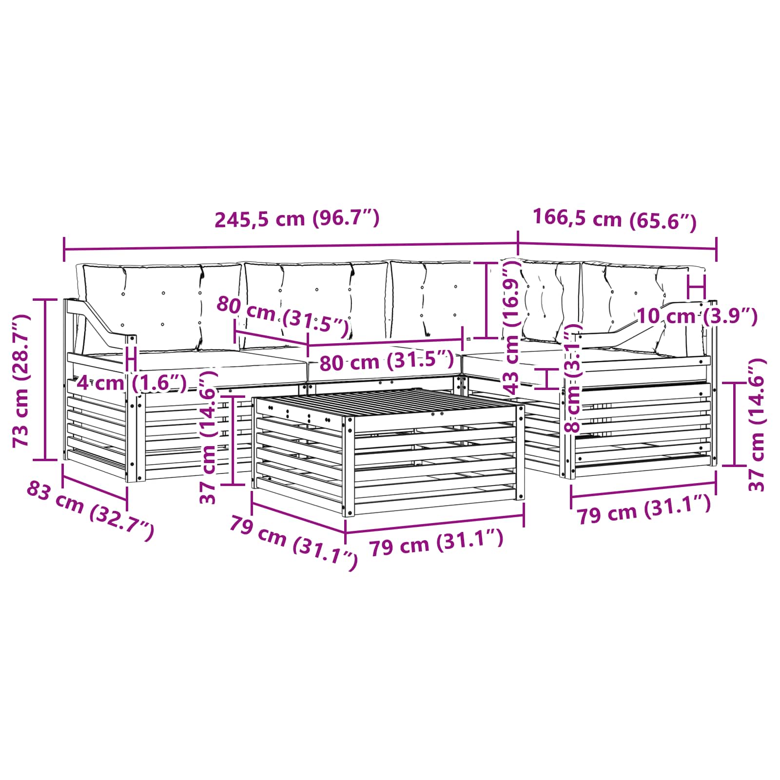 - Gesamtabmessungen: 79 x 79 x 37 cm (L x B x H)