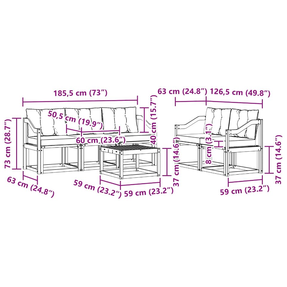 - 5 x Sitzkissen: 60 x 50,5 x 8 cm (LxBxH)