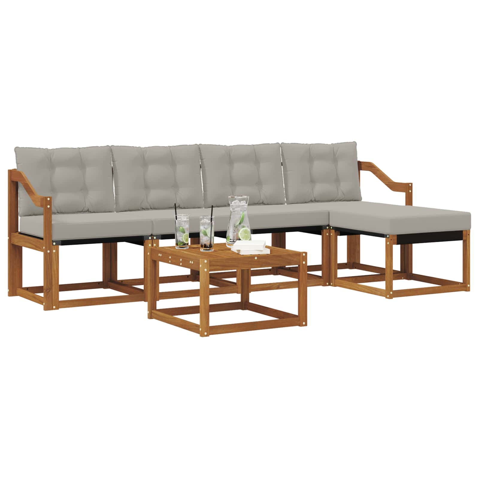 Das Gartenmöbelset kombiniert Stil und Nutzen und wird zum Star in jedem Garten oder auf jeder Terrasse. Es hat ein modernes Design mit klaren Linien und minimalistischen Details, das Eleganz ausstrahlt und dir hilft, im Freien zu entspannen oder Zeit mit Freunden zu verbringen. Hergestellt aus solidem Akazienholz, ist es nicht nur haltbar, sondern sieht auch gut aus – die perfekte Wahl für alle, die praktische und schicke Möbel suchen. Langlebiges Massivholz Akazie: Dieses Set ist aus solidem Akazienholz, das für seine hohe Langlebigkeit und Wetterbeständigkeit bekannt ist. Robuste Verarbeitung sorgt für Stabilität und der natürliche Farbton bringt Gemütlichkeit in jeden Garten oder auf jede Terrasse. Wetterbeständiges Design: Die lackierte Oberfläche schützt vor Sonne, Regen und anderen Witterungseinflüssen. So bleibt das Set lange schön und funktional für deinen Garten, deine Terrasse oder deinen Hinterhof. Komponenten & Design: Jedes Stück, von den Armlehnen bis zu den Rückenlehnen, wurde für Stil und Nutzen gestaltet. Komfortable Details sorgen dafür, dass du es dir gut gehen lassen kannst, und das ansprechende Design macht das Set zur perfekten Wahl für verschiedene Outdoor-Anlässe. Komfort & Vielseitigkeit: Das modulare Design erlaubt flexible Aufstellungen, die sich an deine Wünsche anpassen lassen. Es ist ideal zum Entspannen, für gemeinsame Momente oder ruhige Lesestunden und passt sich jedem Außenbereich an. Einfache Pflege & Wartung: Halte die Möbel in Topform, indem du mit einem feuchten Tuch drüberwischt und schrubben oder aggressive Reiniger vermeidest. Regelmäßige Pflege erhält das Aussehen und verlängert die Lebensdauer.