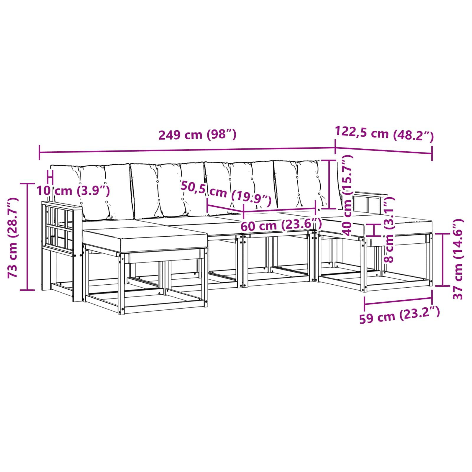 - Gesamtabmessungen: 249 x 122,5 x 73 cm (L x B x H)