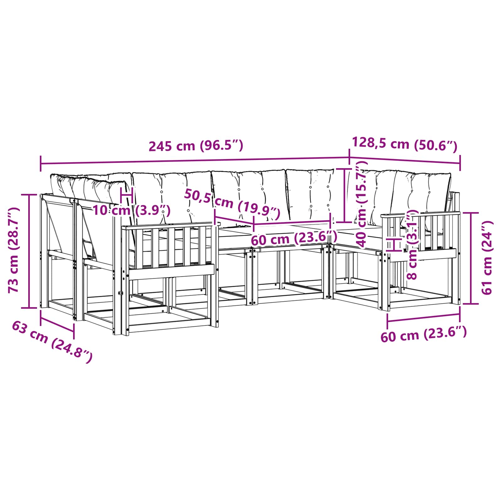 - 8 x Rückenkissen: 60 x 40 x 10 cm (LxBxH)