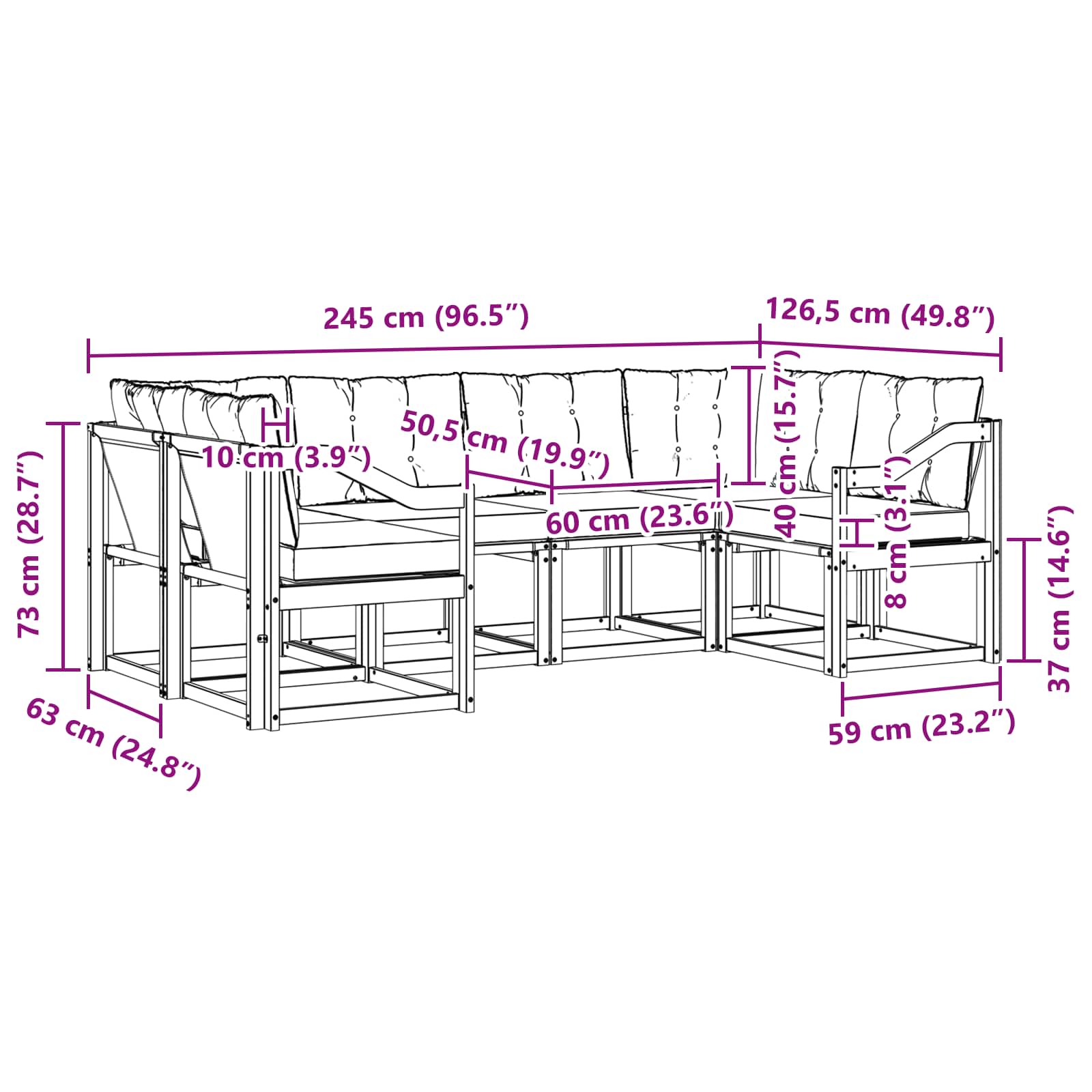 - 8 x Rückenkissen: 60 x 40 x 10 cm (LxBxH)