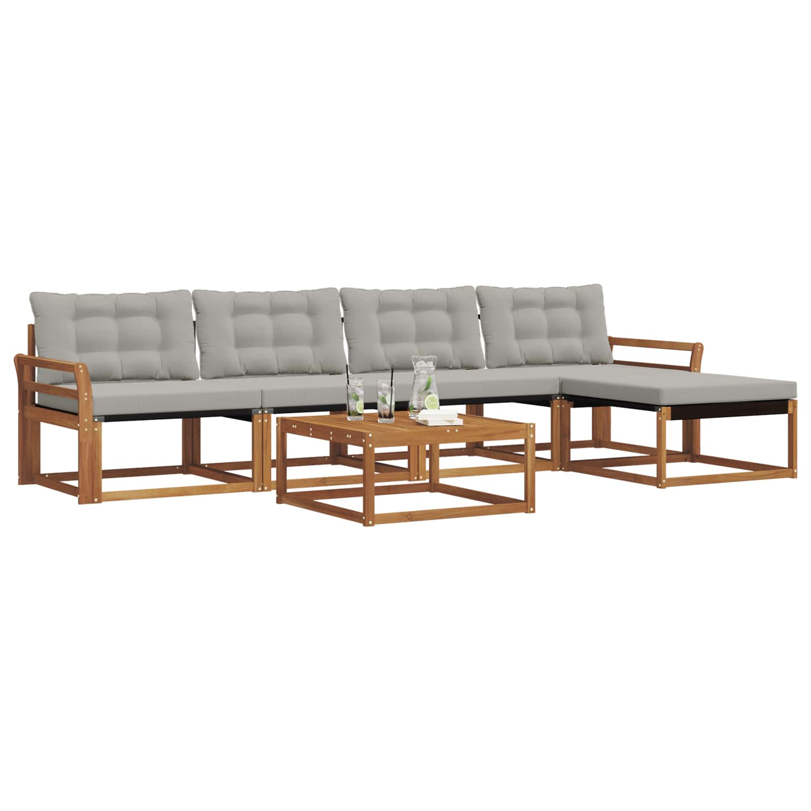 Dieses moderne Sofa-Set wertet deinen Garten oder deine Terrasse echt auf. Es kombiniert minimalistisches Design mit robuster Funktionalität und ist ideal für alle, die die Einfachheit und Eleganz der natürlichen Elemente schätzen. Es ist die perfekte Auszeit im Freien und wurde mit viel Liebe zum Detail entworfen – ideal für gesellige Zusammenkünfte oder ruhige Momente der Reflexion. Hochwertige Materialien: Das Set besteht aus solidem Akazienholz und Textilene und ist langlebig und ästhetisch. Die warmen, natürlichen Holzfarben harmonieren perfekt mit dem eleganten Textilene-Stoff und machen das Sofa-Set zu einem zeitlosen Element in deinem Garten. Enthaltene Komponenten: Bequeme Armlehnen aus solidem Akazienholz sorgen für Komfort und Stil. Im Set sind auch wetterfeste Outdoor-Kissen enthalten, die dick gepolstert sind und ein gemütliches Sitzen ermöglichen. Die unterstützende Rückenlehne trägt zur Entspannung bei. Schlaue Features: Dank des modularen Aufbaus kannst du die Anordnung easy variieren. Die fade-resistente Oberfläche sorgt für eine einfache Pflege und bewahrt die lebendige Optik im Laufe der Zeit. Die praktischen Armlehnen erhöhen den Sitzkomfort. Vielseitige Nutzung: Perfekt geeignet für Terrassen und Gärten. Die großzügige Anordnung bietet viele Nutzungsmöglichkeiten, vom Entspannen allein bis zu geselligen Treffen, und passt sich deinen Bedürfnissen spielend an. Pflege & Wartung: Pflege das Sofa-Set ganz einfach mit ein paar einfachen Schritten – benutze ein feuchtes Tuch zum Saubermachen. Die Kissen sind abnehmbar und mit einem Reißverschluss ausgestattet, was die Pflege erleichtert und für langanhaltende Frische sorgt.