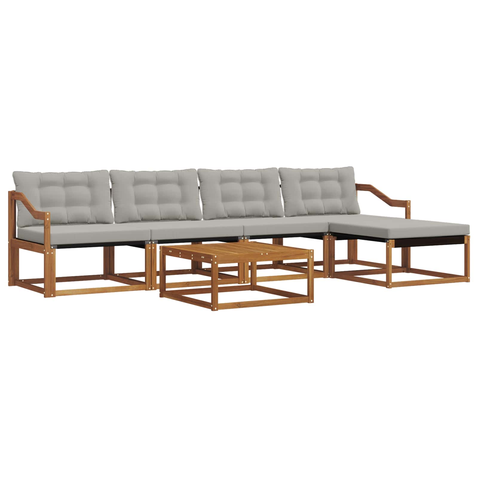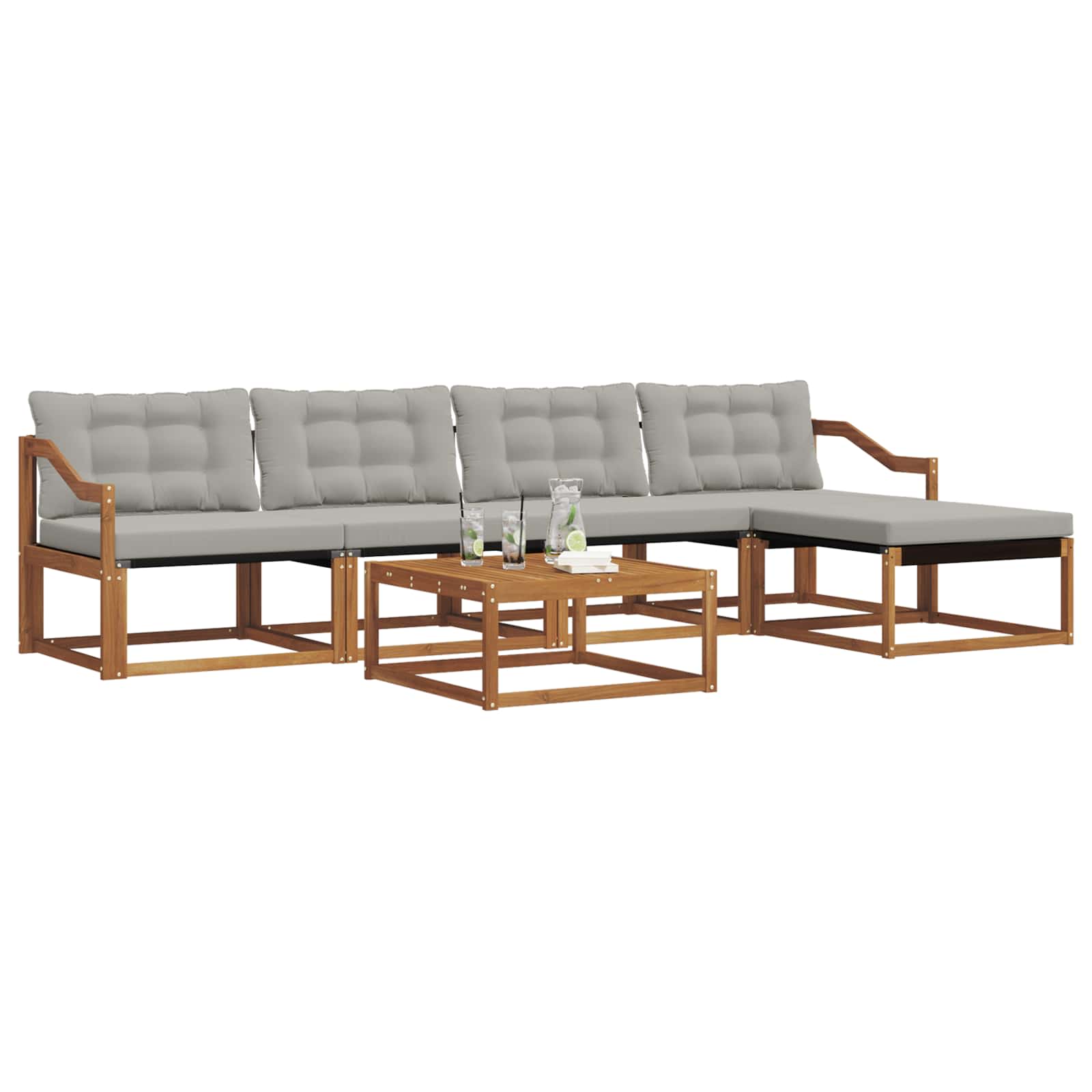 Dieses moderne Sofa-Set wertet deinen Garten oder deine Terrasse echt auf. Es kombiniert minimalistisches Design mit robuster Funktionalität und ist ideal für alle, die die Einfachheit und Eleganz der natürlichen Elemente schätzen. Es ist die perfekte Auszeit im Freien und wurde mit viel Liebe zum Detail entworfen – ideal für gesellige Zusammenkünfte oder ruhige Momente der Reflexion. Hochwertige Materialien: Das Set besteht aus solidem Akazienholz und Textilene und ist langlebig und ästhetisch. Die warmen, natürlichen Holzfarben harmonieren perfekt mit dem eleganten Textilene-Stoff und machen das Sofa-Set zu einem zeitlosen Element in deinem Garten. Enthaltene Komponenten: Bequeme Armlehnen aus solidem Akazienholz sorgen für Komfort und Stil. Im Set sind auch wetterfeste Outdoor-Kissen enthalten, die dick gepolstert sind und ein gemütliches Sitzen ermöglichen. Die unterstützende Rückenlehne trägt zur Entspannung bei. Schlaue Features: Dank des modularen Aufbaus kannst du die Anordnung easy variieren. Die fade-resistente Oberfläche sorgt für eine einfache Pflege und bewahrt die lebendige Optik im Laufe der Zeit. Die praktischen Armlehnen erhöhen den Sitzkomfort. Vielseitige Nutzung: Perfekt geeignet für Terrassen und Gärten. Die großzügige Anordnung bietet viele Nutzungsmöglichkeiten, vom Entspannen allein bis zu geselligen Treffen, und passt sich deinen Bedürfnissen spielend an. Pflege & Wartung: Pflege das Sofa-Set ganz einfach mit ein paar einfachen Schritten – benutze ein feuchtes Tuch zum Saubermachen. Die Kissen sind abnehmbar und mit einem Reißverschluss ausgestattet, was die Pflege erleichtert und für langanhaltende Frische sorgt.