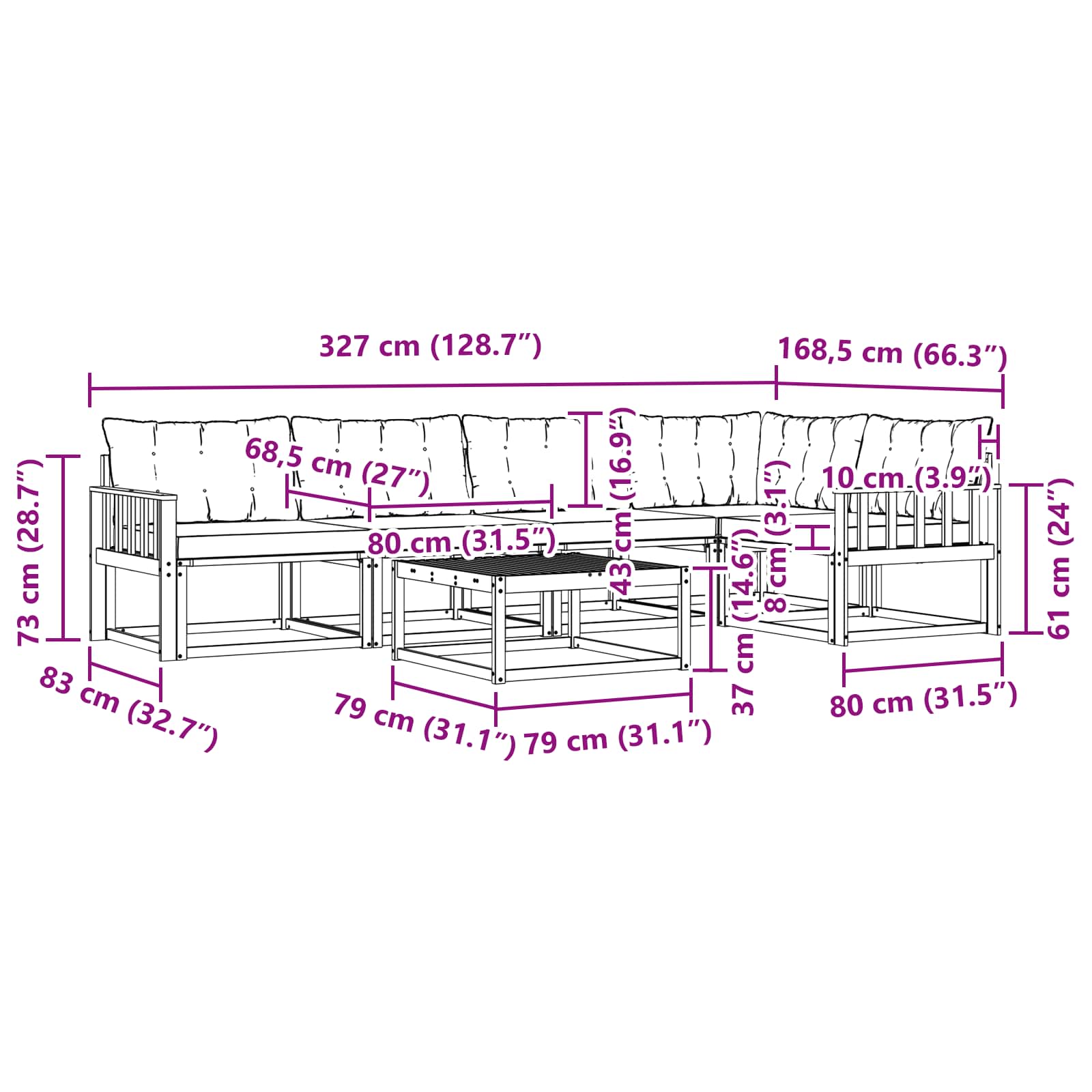 - Gesamtabmessungen: 79 x 79 x 37 cm (L x B x H)