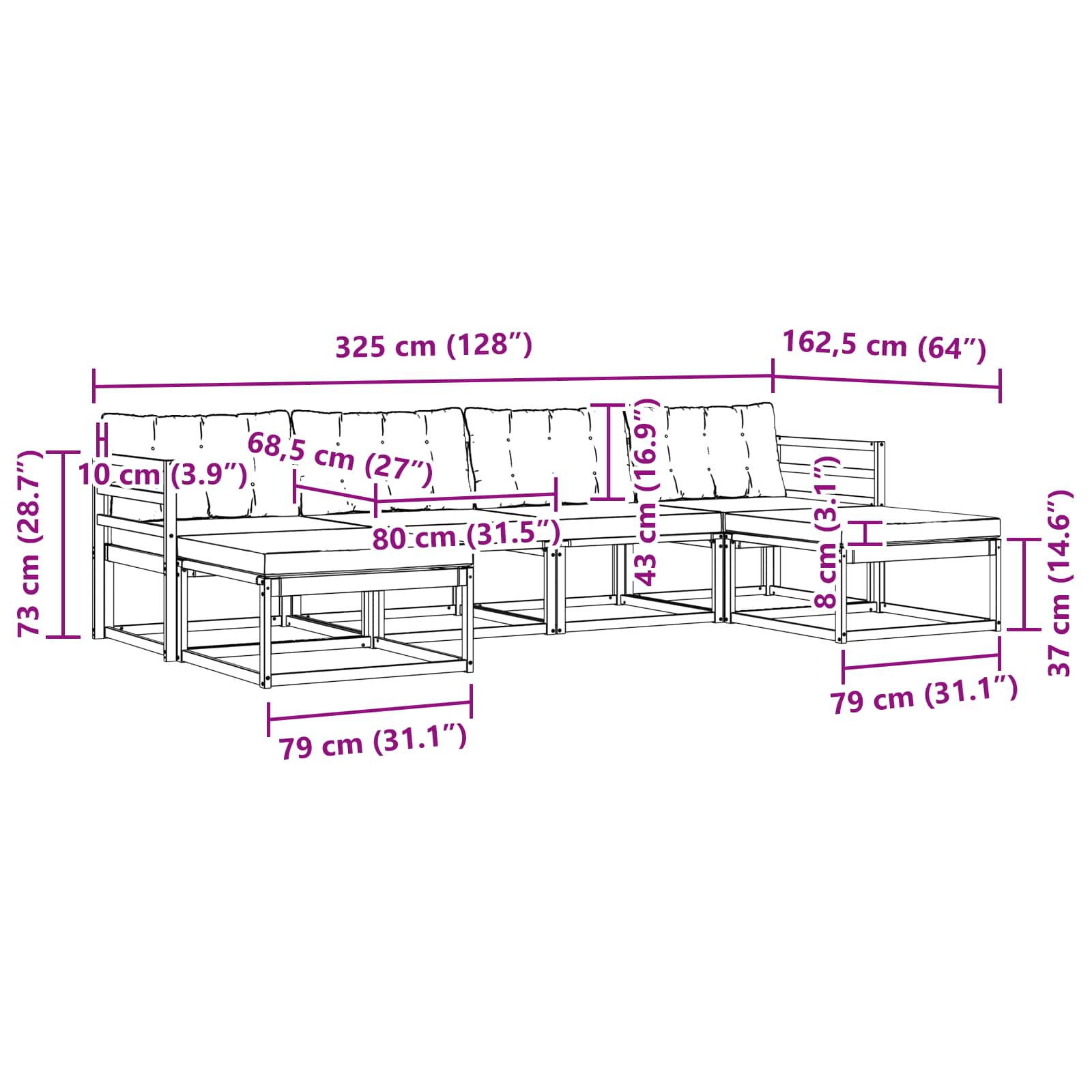 - Gesamtabmessungen: 325 x 162,5 x 73 cm (L x B x H)