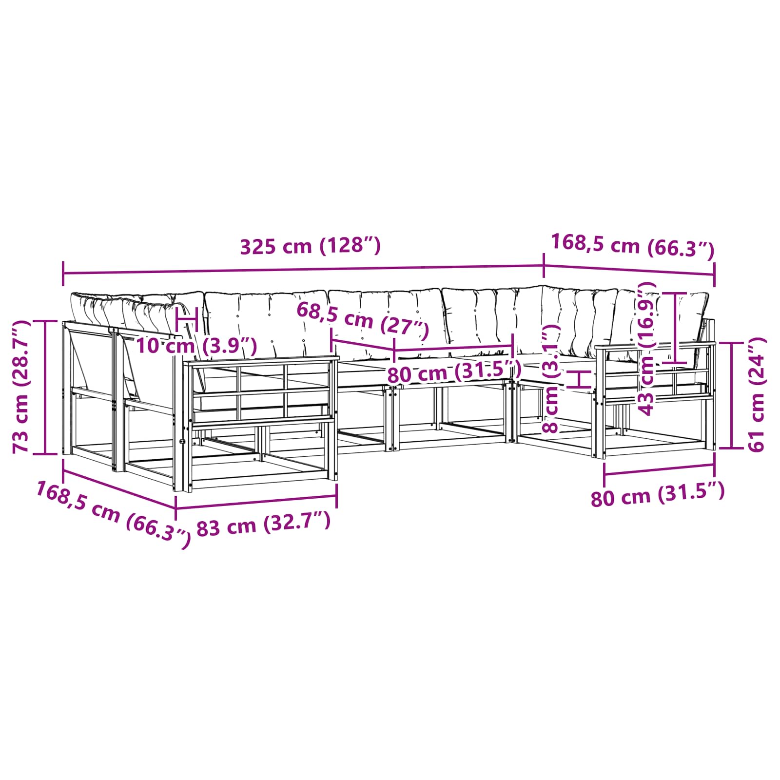- Gesamtabmessungen: 325 x 168,5 x 73 cm (L x B x H)