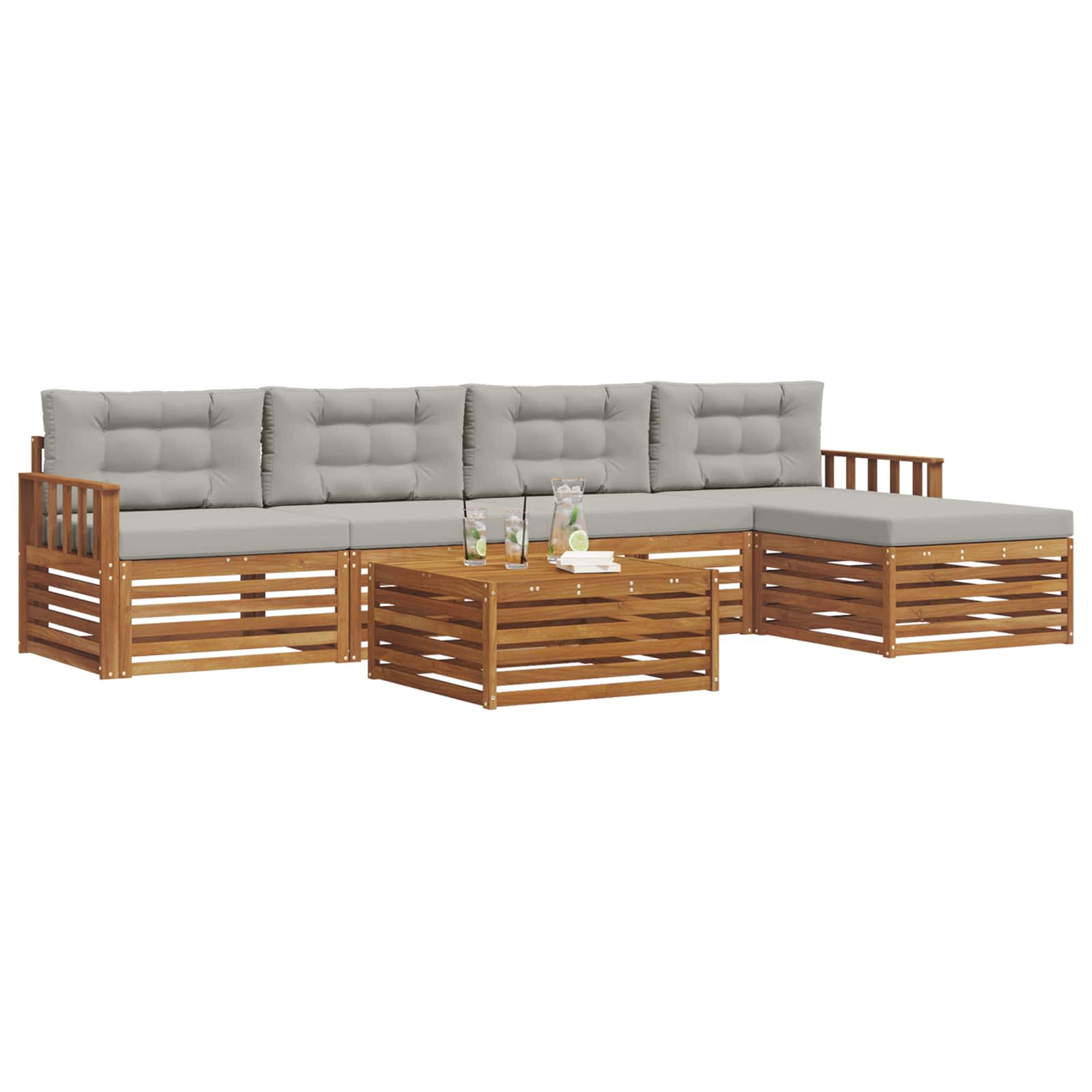 Das Outdoor-Möbelset kombiniert Stil und Funktion mit einem echten Hingucker für deinen Garten oder deine Terrasse. Das moderne Design mit klaren Linien und wenig Schnickschnack verleiht eine elegante Note, die besten für entspannte Stunden draußen und gesellige Runden geeignet ist. Aus massivem Akazienholz gefertigt, ist das Set stabil und sieht auch nach längerer Zeit noch toll aus, was es zur perfekten Wahl macht, wenn du schöne und praktische Gartenmöbel suchst. Langlebiges Massivholz Akazie: Das Outdoor-Möbelset aus massivem Akazienholz ist bekannt für seine Haltbarkeit und Widerstandsfähigkeit gegen Wetter. Die stabile Bauweise sorgt für sicheren Halt und langfristige Stabilität, während die warmen, natürlichen Töne jeden Garten oder jede Terrasse aufwerten. Wetterfeste Konstruktion: Dieses Möbelset hat eine lackierte Oberfläche, die zusätzlichen Schutz gegen Sonne, leichten Regen und andere Witterungseinflüsse bietet. Die glatte Oberfläche hilft, das Aussehen und die Funktionalität zu bewahren und sorgt dafür, dass es lange in deinem Garten oder auf deiner Terrasse hält. Schickes Design: Jedes Stück, von den Armlehnen bis zu den Rücklehnen, ist stylish und funktional gestaltet. Unterstützende Features bieten zusätzlichen Komfort, während das harmonische Design ein optisch ansprechendes Ensemble kreiert, das für verschiedene Outdoor-Anlässe ideal ist. Komfort & Vielseitigkeit: Das modulare Design erlaubt dir flexible Konfigurationen, die sich deinen Bedürfnissen anpassen. Ob zum Entspannen, geselligem Beisammensein oder stillen Lesen, dieses Set fügt sich mühelos in jede Outdoor-Umgebung ein und sorgt für maximalen Komfort. Einfache Pflege: Halte die Möbel in gutem Zustand, indem du die Oberfläche mit einem feuchten Tuch abwischt. Vermeide aggressive oder scheuernde Reiniger. Regelmäßige Pflege hilft, das Aussehen zu erhalten und die Lebensdauer der Möbel zu verlängern.