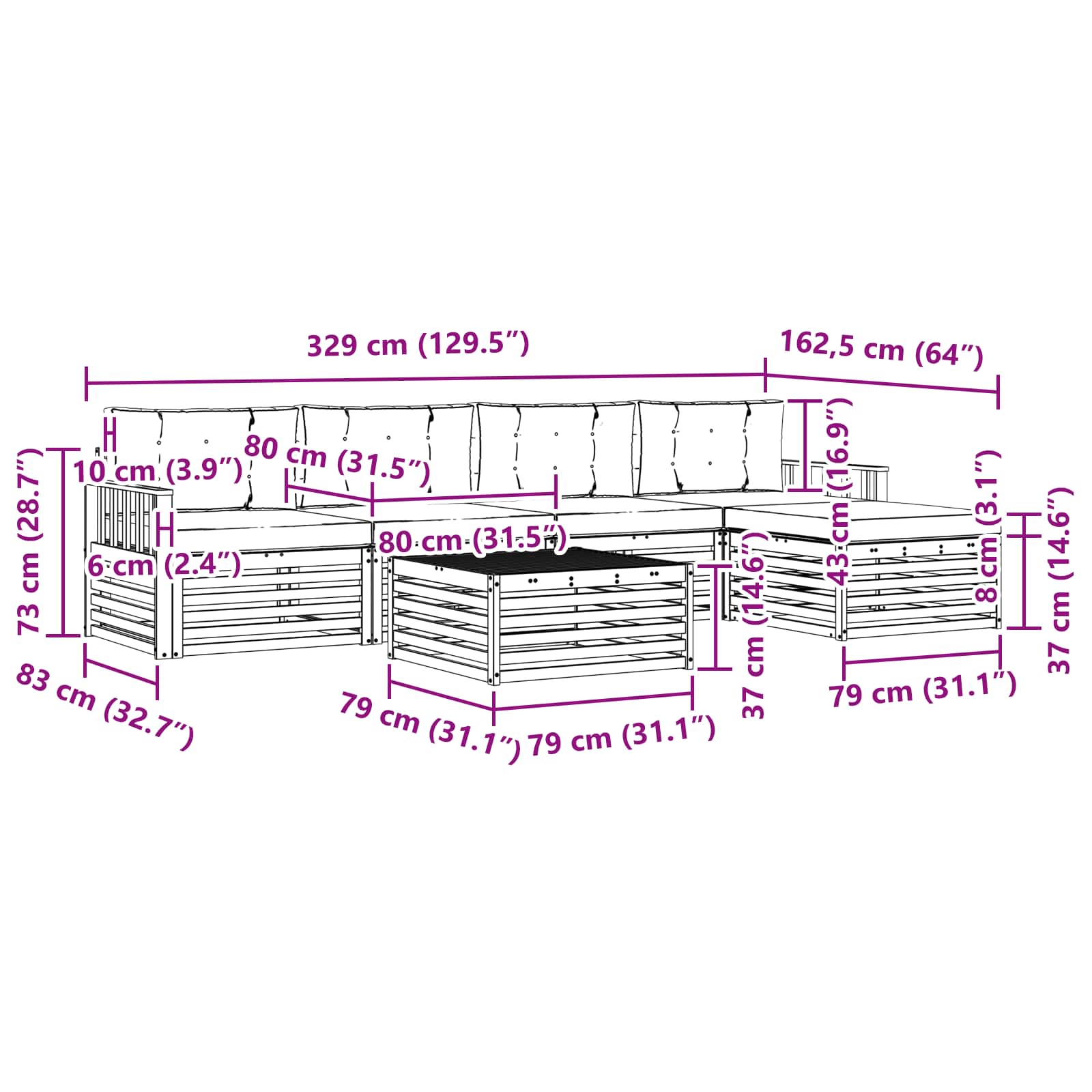 - 5 x Sitzkissen: 80 x 80 x 8 cm (LxBxH)