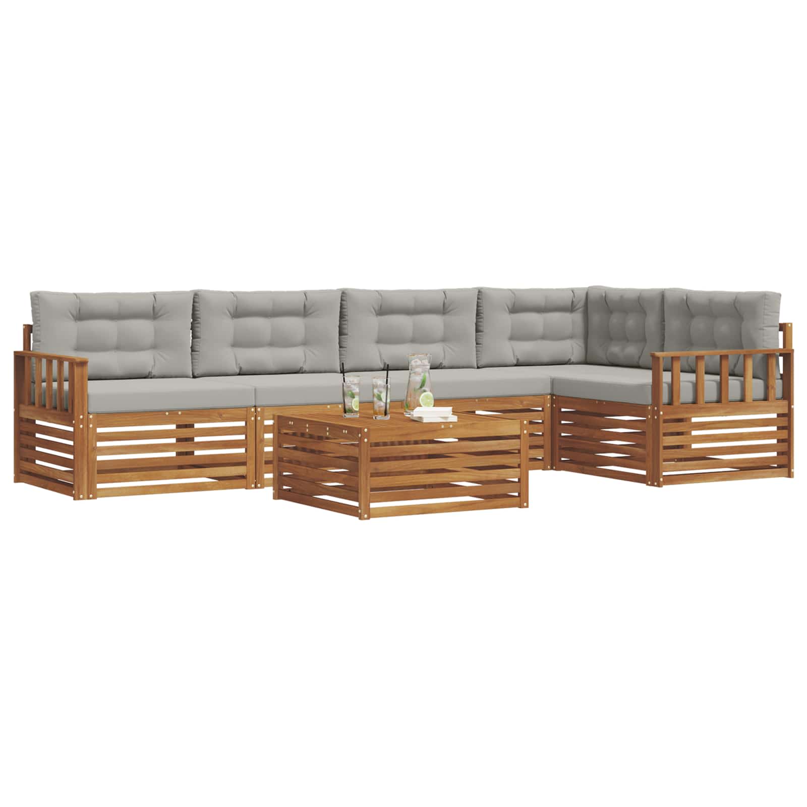 Dieses Outdoor-Möbelset vereint Stil und Funktionalität und wird zum Blickfang für jeden Garten oder Terrasse. Das moderne Design mit klaren Linien und minimalistischen Details gibt dem Ganzen einen eleganten Touch und sorgt gleichzeitig für Entspannung und gemütliche Zusammenkünfte im Freien. Hergestellt aus massivem Akazienholz, garantiert das Set Robustheit und anhaltende Schönheit, perfekt für alle, die praktische und stilvolle Möbel für draußen suchen. Langlebiges massives Akazienholz: Hergestellt aus massivem Akazienholz, ist dieses Set bekannt für seine Haltbarkeit und Widerstandsfähigkeit gegen Wetter. Die robuste Bauweise sorgt für zuverlässigen Halt und lange Stabilität und die warme, natürliche Farbe wertet jeden Garten oder Terrasse auf. Wetterbeständiges Design: Mit einer beschichteten Oberfläche bietet dieses Möbelset guten Schutz gegen Sonne, leichten Regen und andere äußere Einflüsse. Das polierte Finish bewahrt sowohl Aussehen als auch Funktionalität und sorgt für lange Haltbarkeit in deinem Garten, auf der Terrasse oder im Hinterhof. Komponenten & Design: Jedes Teil, von den Armlehnen bis zu den Rückenlehnen, wird für Stil und Funktionalität entworfen. Unterstützende Eigenschaften sorgen für mehr Komfort und das zusammenhängende Design schafft ein ansprechendes Gesamtbild für verschiedene Outdoor-Events. Komfort & Vielseitigkeit: Das modulare Design ermöglicht flexible Anordnungen, die sich an verschiedene Räume und Bedürfnisse anpassen. Perfekt zum Entspannen, für Feiern oder ruhige Lesestunden, passt sich dieses Set mühelos deiner Außenumgebung an und maximiert den Komfort und die Möglichkeiten. Einfache Pflege & Wartung: Halte deine Möbel in einem guten Zustand, indem du die Oberfläche mit einem feuchten Tuch reinigst und scharfe Reiniger vermeidest. Regelmäßige Pflege hilft, das Aussehen zu bewahren und die Lebensdauer der Möbel zu verlängern.