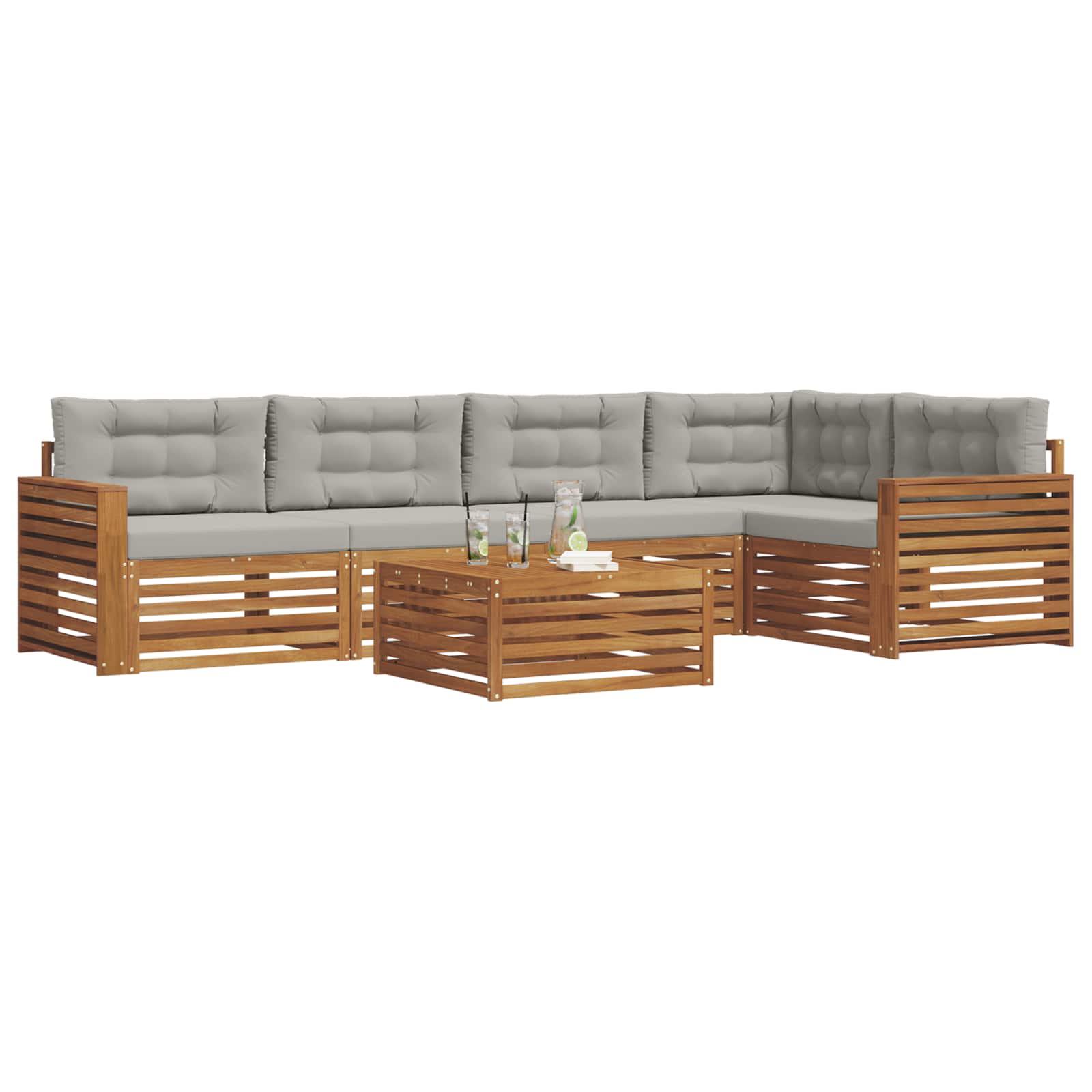 Dieses Outdoor-Möbelset vereint Stil und Funktionalität und wird zum Blickfang für jeden Garten oder Terrasse. Das moderne Design mit klaren Linien und minimalistischen Details gibt dem Ganzen einen eleganten Touch und sorgt gleichzeitig für Entspannung und gemütliche Zusammenkünfte im Freien. Hergestellt aus massivem Akazienholz, garantiert das Set Robustheit und anhaltende Schönheit, perfekt für alle, die praktische und stilvolle Möbel für draußen suchen. Langlebiges massives Akazienholz: Hergestellt aus massivem Akazienholz, ist dieses Set bekannt für seine Haltbarkeit und Widerstandsfähigkeit gegen Wetter. Die robuste Bauweise sorgt für zuverlässigen Halt und lange Stabilität und die warme, natürliche Farbe wertet jeden Garten oder Terrasse auf. Wetterbeständiges Design: Mit einer beschichteten Oberfläche bietet dieses Möbelset guten Schutz gegen Sonne, leichten Regen und andere äußere Einflüsse. Das polierte Finish bewahrt sowohl Aussehen als auch Funktionalität und sorgt für lange Haltbarkeit in deinem Garten, auf der Terrasse oder im Hinterhof. Komponenten & Design: Jedes Teil, von den Armlehnen bis zu den Rückenlehnen, wird für Stil und Funktionalität entworfen. Unterstützende Eigenschaften sorgen für mehr Komfort und das zusammenhängende Design schafft ein ansprechendes Gesamtbild für verschiedene Outdoor-Events. Komfort & Vielseitigkeit: Das modulare Design ermöglicht flexible Anordnungen, die sich an verschiedene Räume und Bedürfnisse anpassen. Perfekt zum Entspannen, für Feiern oder ruhige Lesestunden, passt sich dieses Set mühelos deiner Außenumgebung an und maximiert den Komfort und die Möglichkeiten. Einfache Pflege & Wartung: Halte deine Möbel in einem guten Zustand, indem du die Oberfläche mit einem feuchten Tuch reinigst und scharfe Reiniger vermeidest. Regelmäßige Pflege hilft, das Aussehen zu bewahren und die Lebensdauer der Möbel zu verlängern.