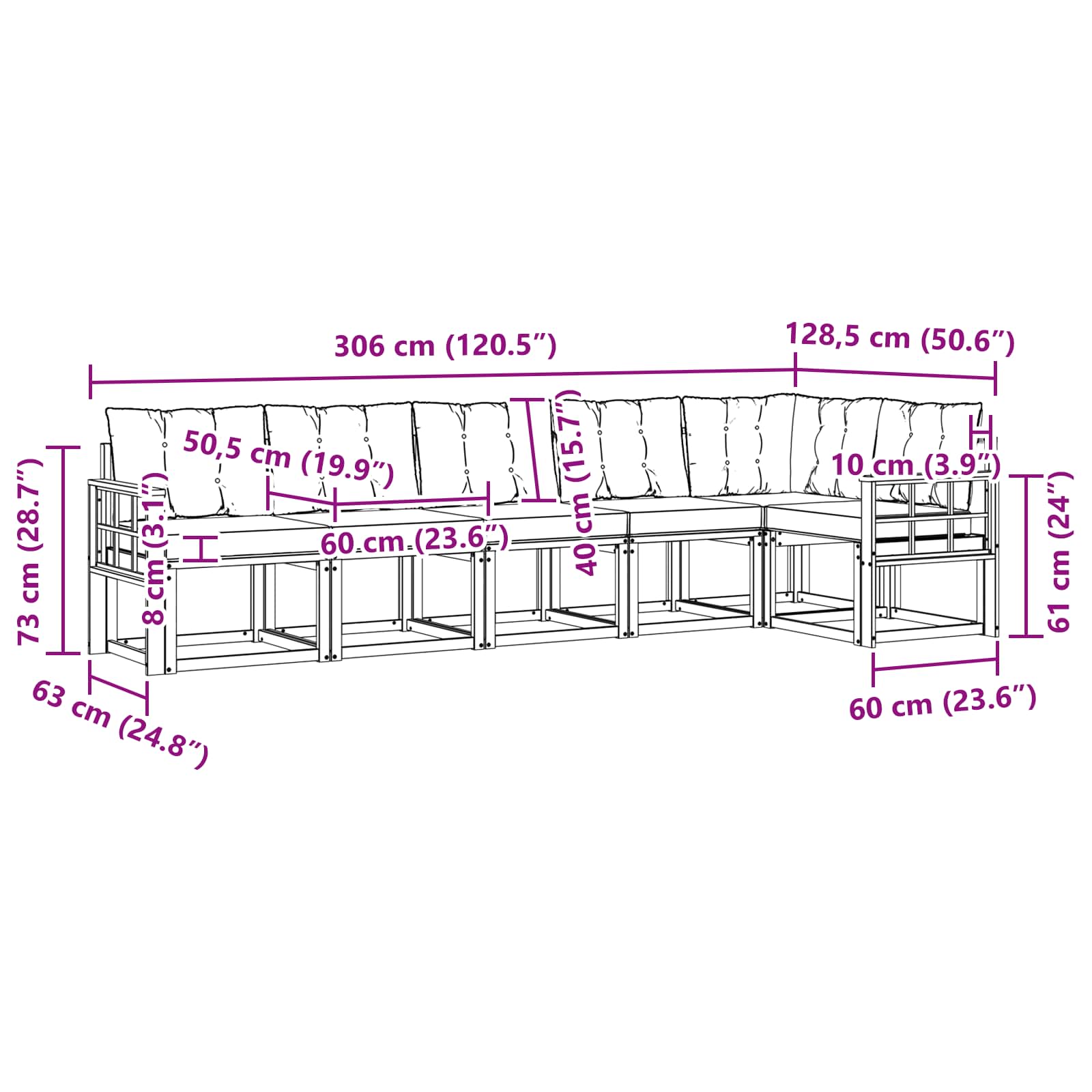 - Gesamtabmessungen: 306 x 128,5 x 73 cm (L x B x H)