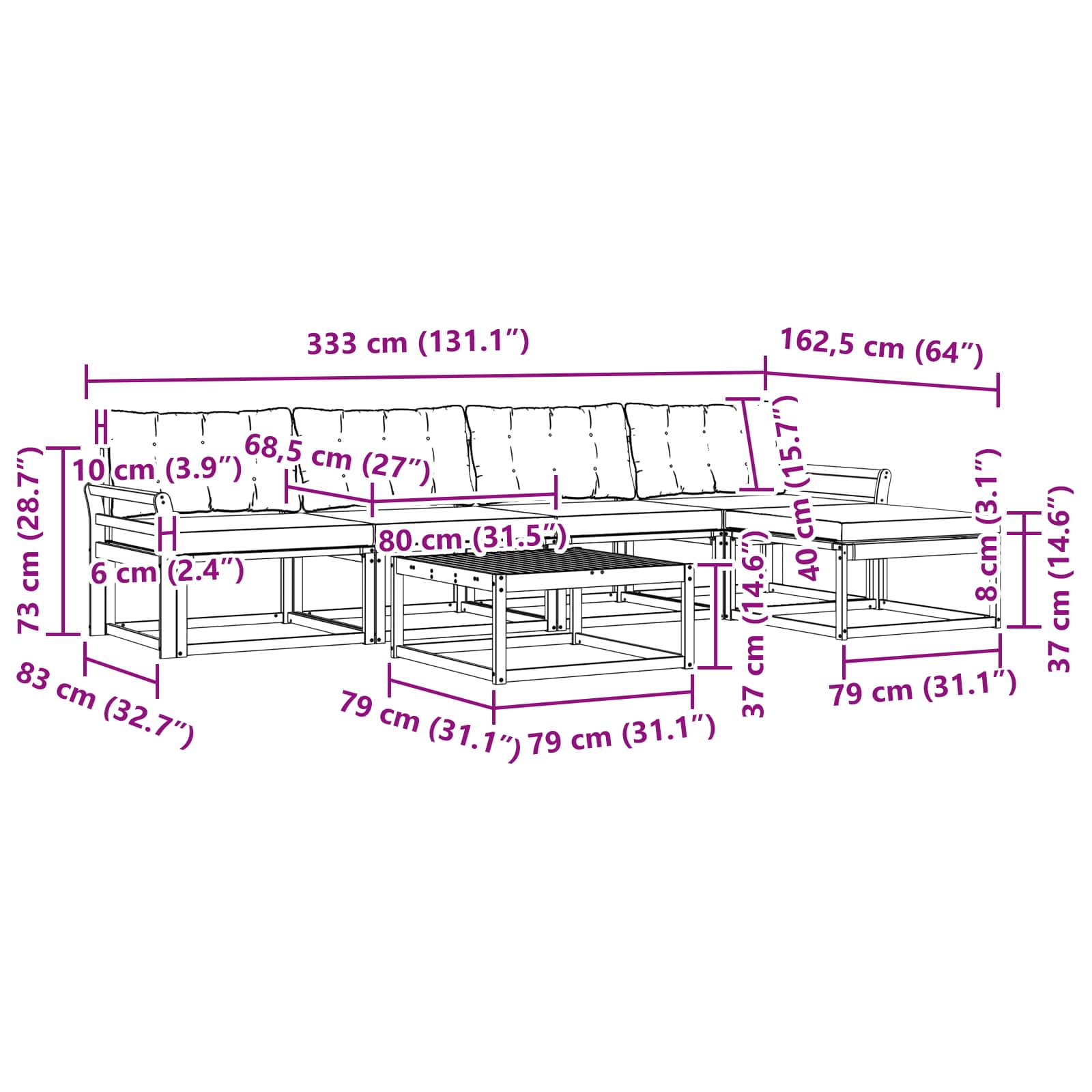 - 4 x Mittelsofa: 79 x 83 x 73 cm (LxBxH)