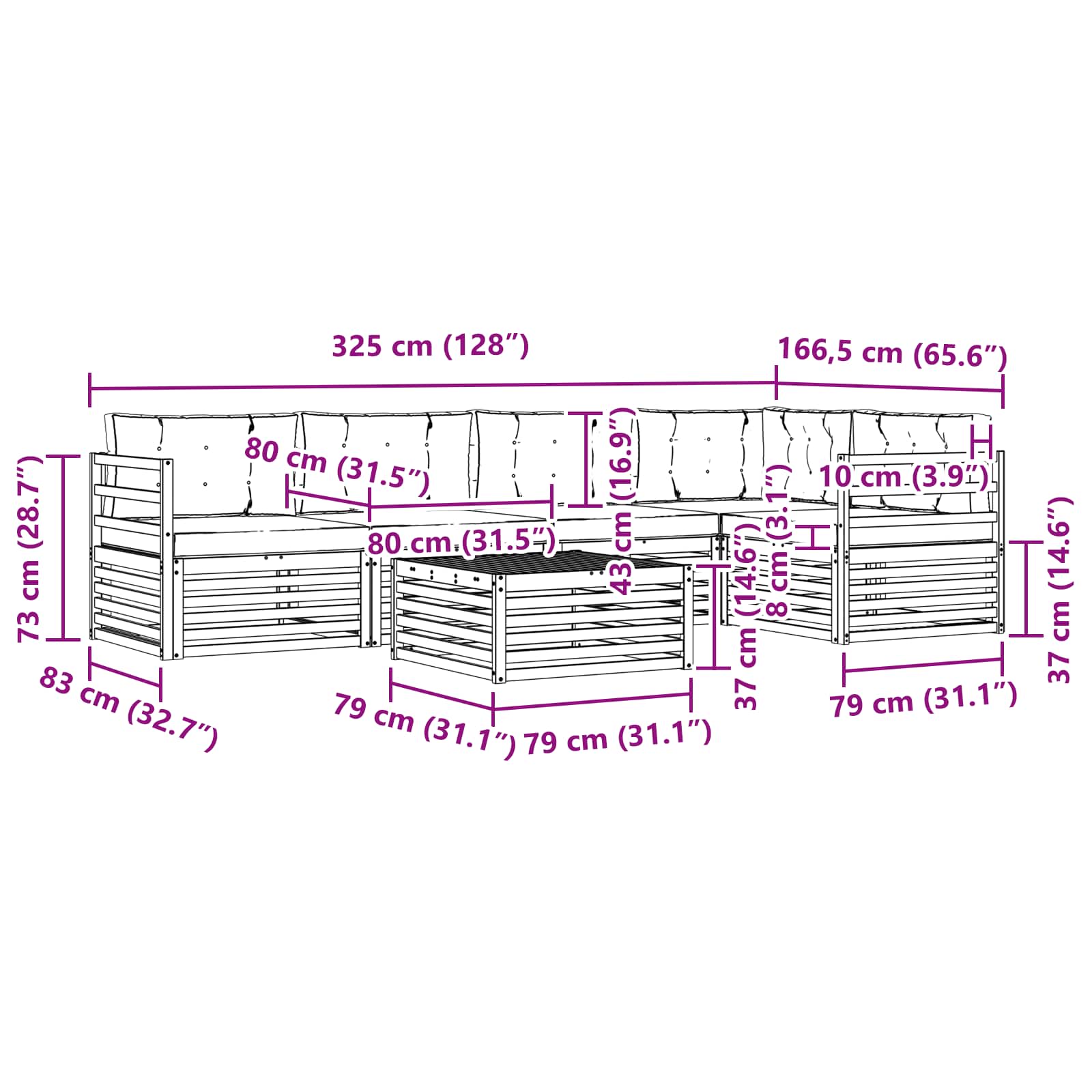 - 6 x Rückenpolster: 80 x 43 x 10 cm (LxBxH)