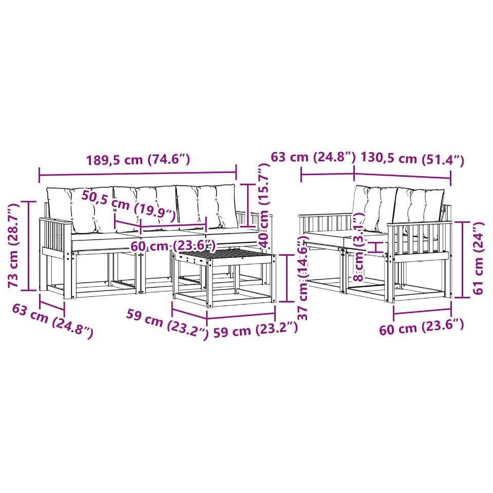 - 5 x Sitzkissen: 60 x 50,5 x 8 cm (LxBxH)