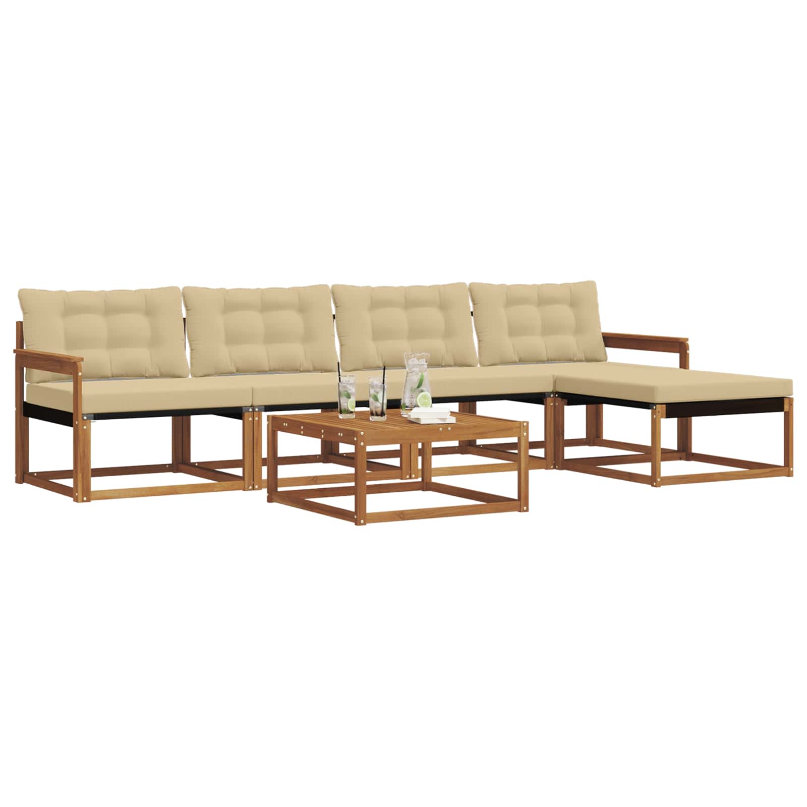 Dieses moderne Sofa-Set wertet deinen Garten oder deine Terrasse echt auf. Es kombiniert minimalistisches Design mit robuster Funktionalität und ist ideal für alle, die die Einfachheit und Eleganz der natürlichen Elemente schätzen. Es ist die perfekte Auszeit im Freien und wurde mit viel Liebe zum Detail entworfen – ideal für gesellige Zusammenkünfte oder ruhige Momente der Reflexion. Hochwertige Materialien: Das Set besteht aus solidem Akazienholz und Textilene und ist langlebig und ästhetisch. Die warmen, natürlichen Holzfarben harmonieren perfekt mit dem eleganten Textilene-Stoff und machen das Sofa-Set zu einem zeitlosen Element in deinem Garten. Enthaltene Komponenten: Bequeme Armlehnen aus solidem Akazienholz sorgen für Komfort und Stil. Im Set sind auch wetterfeste Outdoor-Kissen enthalten, die dick gepolstert sind und ein gemütliches Sitzen ermöglichen. Die unterstützende Rückenlehne trägt zur Entspannung bei. Schlaue Features: Dank des modularen Aufbaus kannst du die Anordnung easy variieren. Die fade-resistente Oberfläche sorgt für eine einfache Pflege und bewahrt die lebendige Optik im Laufe der Zeit. Die praktischen Armlehnen erhöhen den Sitzkomfort. Vielseitige Nutzung: Perfekt geeignet für Terrassen und Gärten. Die großzügige Anordnung bietet viele Nutzungsmöglichkeiten, vom Entspannen allein bis zu geselligen Treffen, und passt sich deinen Bedürfnissen spielend an. Pflege & Wartung: Pflege das Sofa-Set ganz einfach mit ein paar einfachen Schritten – benutze ein feuchtes Tuch zum Saubermachen. Die Kissen sind abnehmbar und mit einem Reißverschluss ausgestattet, was die Pflege erleichtert und für langanhaltende Frische sorgt.