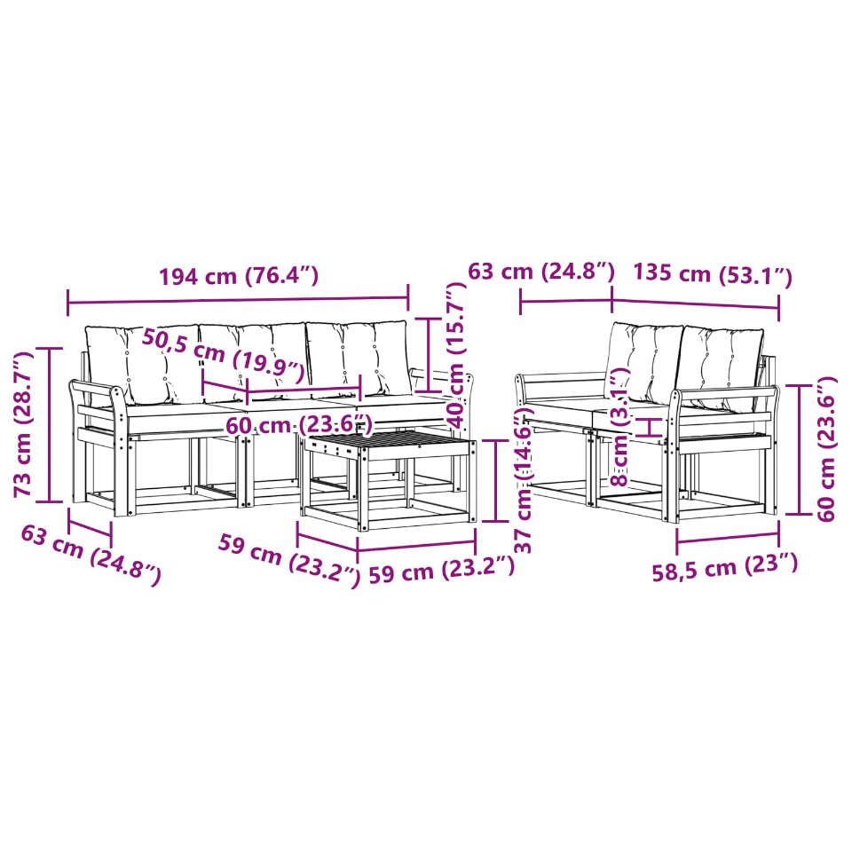 - 5 x Sitzkissen: 60 x 50,5 x 8 cm (LxBxH)
