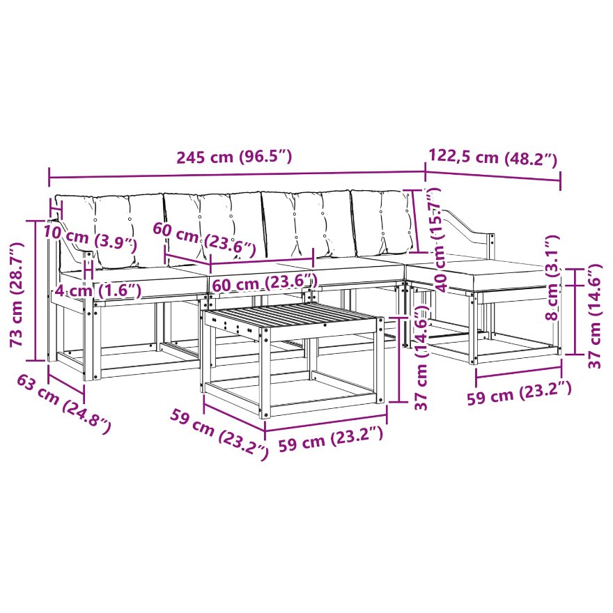 - 4 x Sitzkissen: 60 x 50,5 x 8 cm (LxBxH)