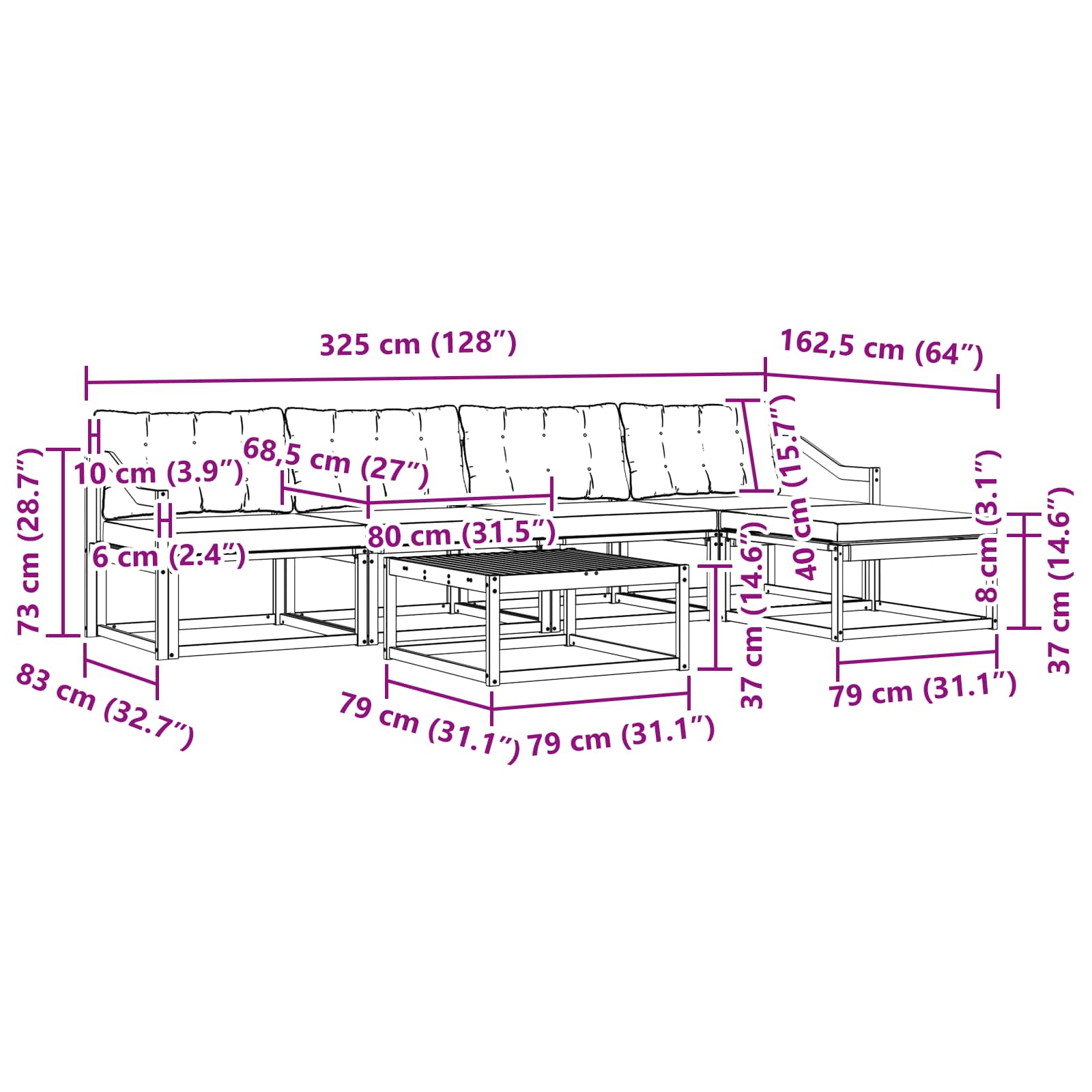 - Gesamtabmessungen: 79 x 79 x 37 cm (L x B x H)