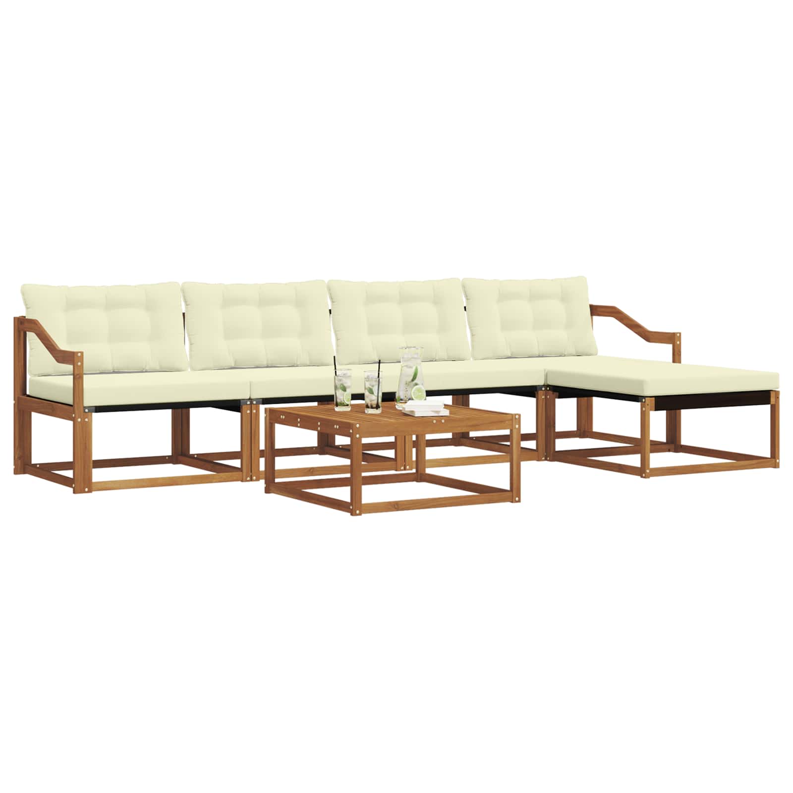 Dieses moderne Sofa-Set wertet deinen Garten oder deine Terrasse echt auf. Es kombiniert minimalistisches Design mit robuster Funktionalität und ist ideal für alle, die die Einfachheit und Eleganz der natürlichen Elemente schätzen. Es ist die perfekte Auszeit im Freien und wurde mit viel Liebe zum Detail entworfen – ideal für gesellige Zusammenkünfte oder ruhige Momente der Reflexion. Hochwertige Materialien: Das Set besteht aus solidem Akazienholz und Textilene und ist langlebig und ästhetisch. Die warmen, natürlichen Holzfarben harmonieren perfekt mit dem eleganten Textilene-Stoff und machen das Sofa-Set zu einem zeitlosen Element in deinem Garten. Enthaltene Komponenten: Bequeme Armlehnen aus solidem Akazienholz sorgen für Komfort und Stil. Im Set sind auch wetterfeste Outdoor-Kissen enthalten, die dick gepolstert sind und ein gemütliches Sitzen ermöglichen. Die unterstützende Rückenlehne trägt zur Entspannung bei. Schlaue Features: Dank des modularen Aufbaus kannst du die Anordnung easy variieren. Die fade-resistente Oberfläche sorgt für eine einfache Pflege und bewahrt die lebendige Optik im Laufe der Zeit. Die praktischen Armlehnen erhöhen den Sitzkomfort. Vielseitige Nutzung: Perfekt geeignet für Terrassen und Gärten. Die großzügige Anordnung bietet viele Nutzungsmöglichkeiten, vom Entspannen allein bis zu geselligen Treffen, und passt sich deinen Bedürfnissen spielend an. Pflege & Wartung: Pflege das Sofa-Set ganz einfach mit ein paar einfachen Schritten – benutze ein feuchtes Tuch zum Saubermachen. Die Kissen sind abnehmbar und mit einem Reißverschluss ausgestattet, was die Pflege erleichtert und für langanhaltende Frische sorgt.