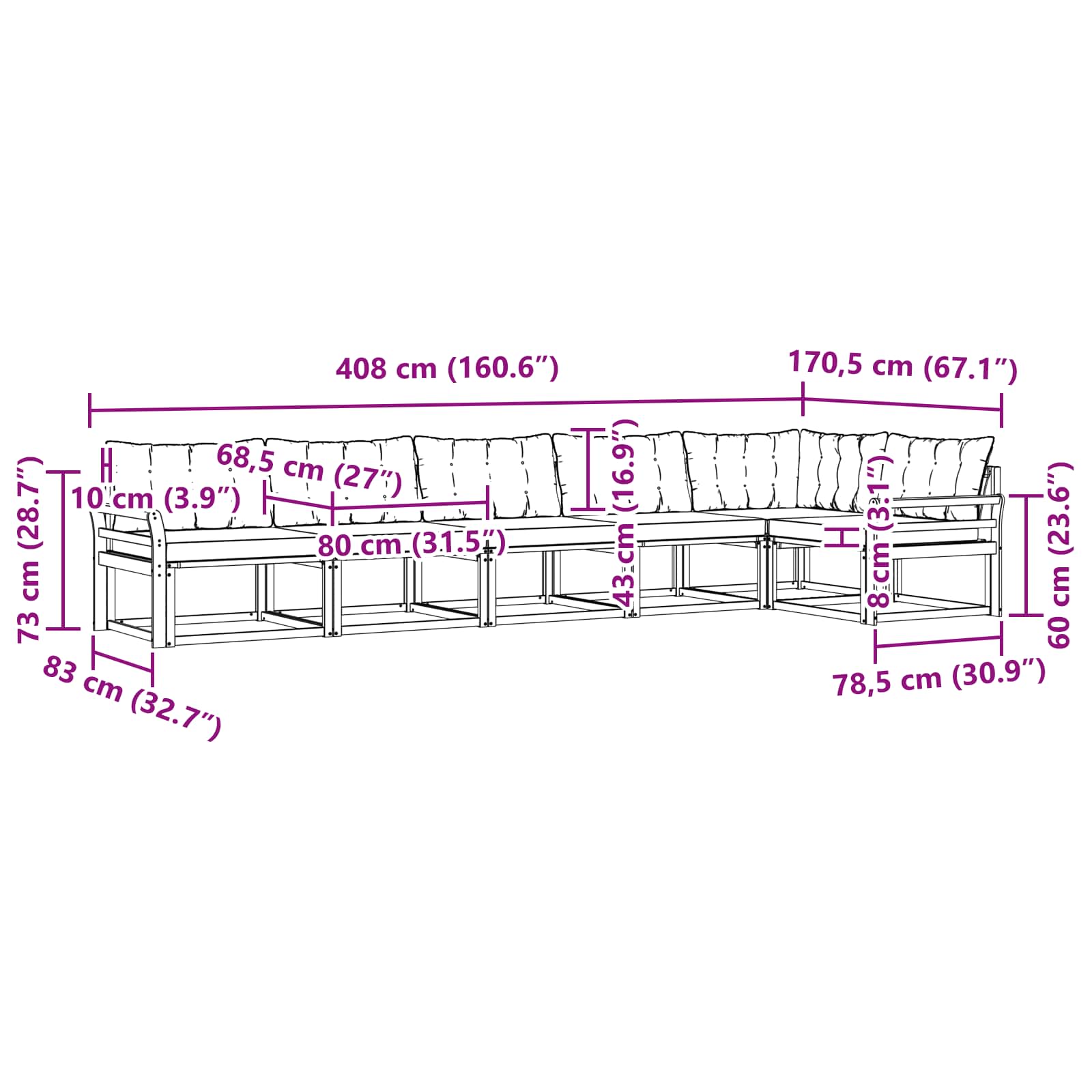 - Gesamtabmessungen: 408 x 170,5 x 73 cm (L x B x H)