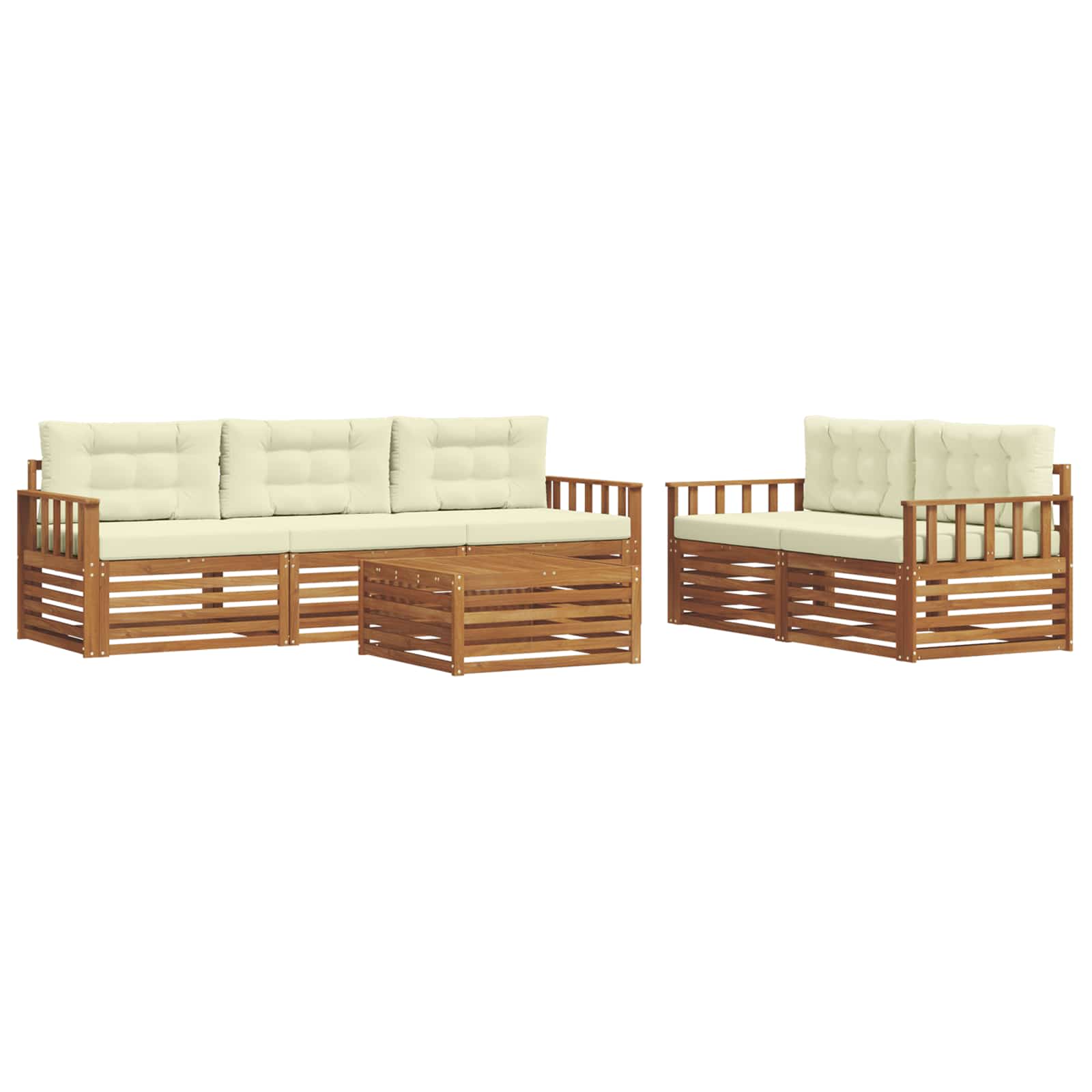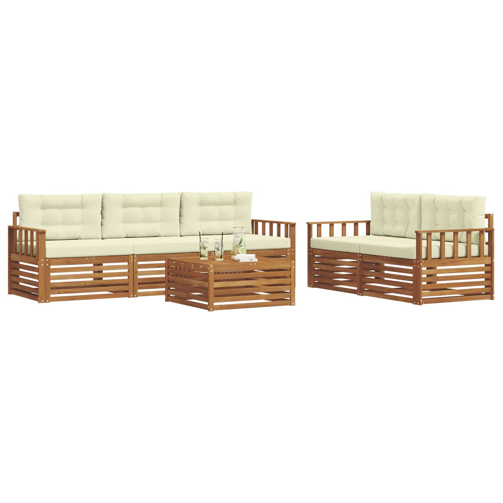 Das Gartenmöbel-Set verbindet coolen Style mit praktischer Funktionalität und wird zum echten Hingucker in jedem Garten oder auf jeder Terrasse. Das moderne Design mit klaren Linien und wenigen Details strahlt Eleganz aus und lädt zum Entspannen im Freien oder zu geselligen Runden ein. Hergestellt aus massivem Akazienholz, sorgt das Set für Langlebigkeit und sieht dabei auch noch gut aus – die perfekte Wahl für alle, die praktische und stylische Gartenmöbel wollen. Massives Akazienholz: Dieses Gartenmöbel-Set ist aus solidem Akazienholz gemacht und bekannt für seine Robustheit und Wetterbeständigkeit. Die stabile Bauweise gibt dir verlässliche Unterstützung und langanhaltende Stabilität, während der warme, natürliche Farbton jeden Garten oder jede Terrasse verschönert. Wetterfestes Design: Mit einer lackierten Oberfläche bietet dieses Möbelset extra Schutz gegen Sonne, leichten Regen und andere Witterungen. Die polierte Behandlung sorgt dafür, dass das Set toll aussieht und lange hält, egal ob im Garten, auf der Terrasse oder im Hinterhof. Design & Komponenten: Jedes Stück, von den Armlehnen bis zu den Rückenlehnen, wurde für Style und Funktionalität konzipiert. Praktische Features sorgen für zusätzlichen Komfort und das Design sieht einfach toll aus für verschiedene Außenanlässe. Komfort & Flexibilität: Das modulare Design erlaubt dir, die Anordnung flexibel zu ändern, damit es zu deinen Bedürfnissen passt. Perfekt zum Entspannen, für gesellige Treffen oder ruhige Lesestunden – das Set passt sich deinem Außenbereich an und bietet maximalen Komfort. Einfache Pflege: Halte die Möbel in gutem Zustand, indem du die Oberflächen mit einem feuchten Tuch abwischst und scharfe Reiniger vermeidest. Einfache Pflege trägt dazu bei, das Aussehen zu bewahren und die Lebensdauer deiner Möbel zu verlängern.