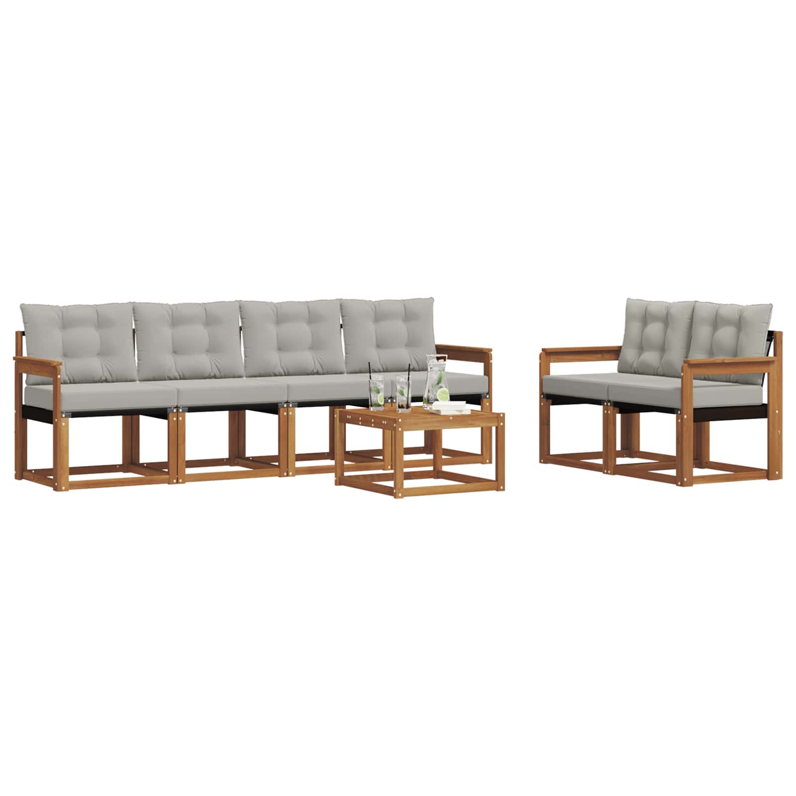 Das Gartenmöbel-Set verbindet Stil und Funktionalität und ist ein echter Hingucker für jeden Garten oder jede Terrasse. Es hat ein modernes Design mit klaren Linien und minimalen Details, das Eleganz verleiht, während es entspannende Aufenthalte und gesellige Treffen unterstützt. Komplett aus massivem Akazienholz gefertigt, ist das Set langlebig und sieht gut aus, perfekt für alle, die sowohl Praktikabilität als auch stilvolles Design bei ihren Außenmöbeln suchen. Langlebiges massives Akazienholz: Dieses Gartenmöbel-Set ist aus massivem Akazienholz und bekannt für seine Langlebigkeit und Widerstandsfähigkeit. Robuste Verarbeitung sorgt für gute Unterstützung und Stabilität, während der warme Holztönen jeden Garten oder jede Terrasse aufwertet. Wetterbeständiges Design: Mit einer lackierten Oberfläche hat das Set einen zusätzlichen Schutz gegen Sonne und leichten Regen. Die polierte Oberfläche bewahrt das schöne Aussehen und die Funktionalität für eine lange Lebensdauer in deinem Garten, auf deiner Terrasse oder in deinem Hinterhof. Komponenten & Design: Jedes Stück, von Armlehnen bis Rückenlehnen, ist sowohl stylisch als auch funktional. Zusätzliche Stütze sorgt für mehr Komfort, während das ansprechende Design ein harmonisches Gesamtbild schafft, das für verschiedene Outdoor-Anlässe passt. Komfort & Vielseitigkeit: Das modulare Design ermöglicht flexible Anordnungen, die zu diversen Räumen und Bedürfnissen passen. Perfekt zum Entspannen, für gesellige Zusammenkünfte oder ruhige Lesemomente – dieses Set passt sich ganz einfach an jede Außenumgebung an und maximiert Komfort und Benutzerfreundlichkeit. Einfache Pflege & Wartung: Halte das Möbelset in gutem Zustand, indem du die Oberfläche mit einem feuchten Tuch reinigst und aggressive Reiniger vermeidest. Regelmäßige Pflege hält das Aussehen frisch und verlängert die Lebensdauer der Möbel.