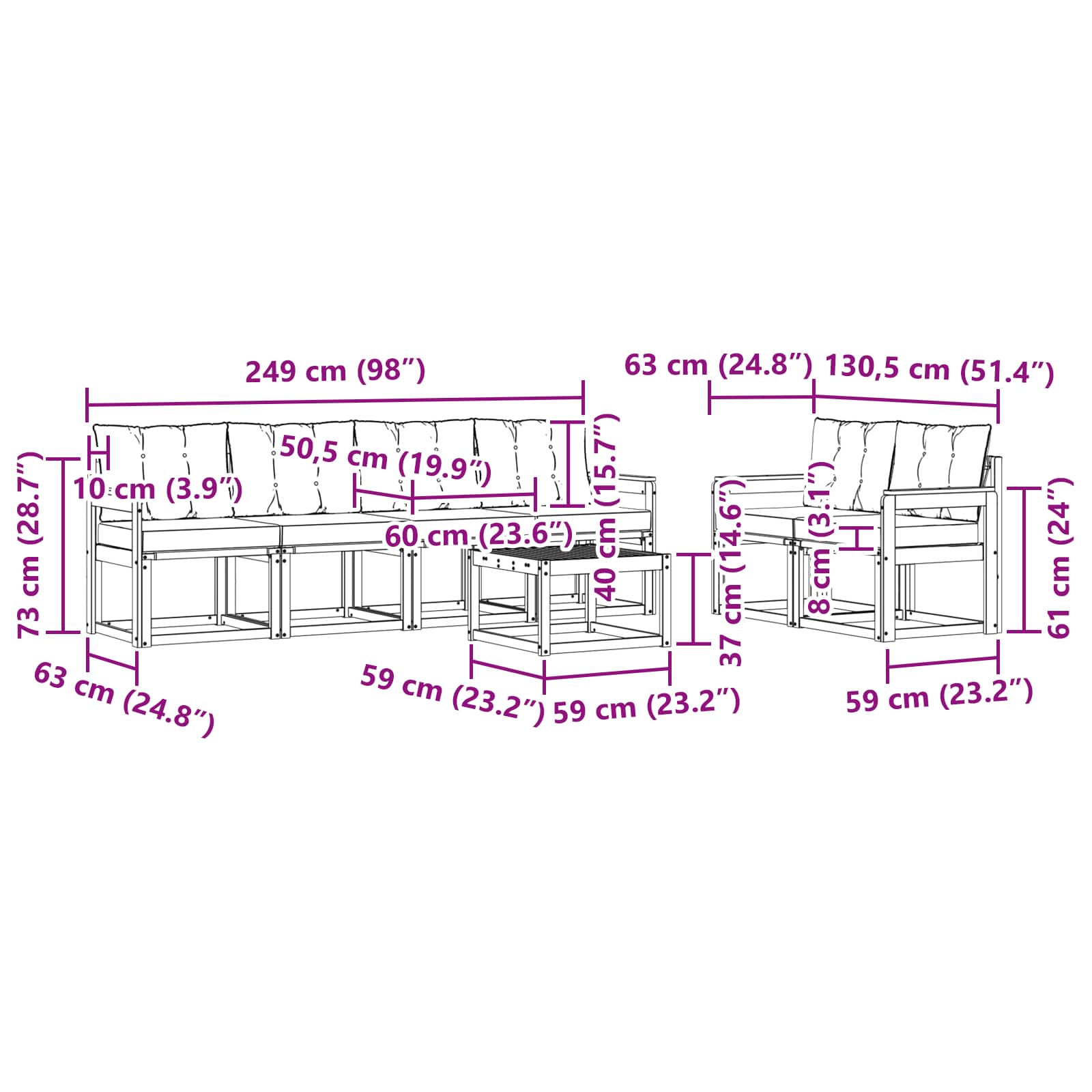- 6 x Sitzkissen: 60 x 50,5 x 8 cm (LxBxH)