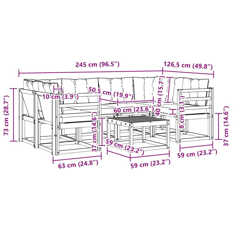 - 8 x Rückenkissen: 60 x 40 x 10 cm (LxBxH)